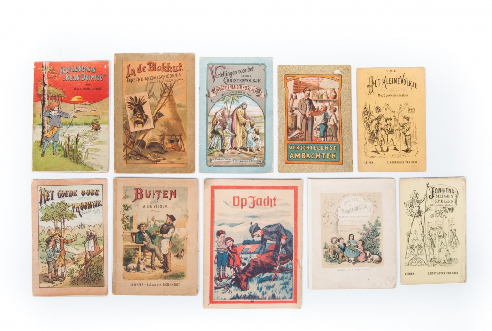 H. J. Tiemersma. Ca. 1890, no publisher. 11 pp. + Op Jacht, no publisher, ca. 1910. 6 pp. + Het kind in Omgang met God. Gebeden voor kinderen van 3 tot 12 jaren. Nieuwe uitgave met gekleurde plaatjes. Gouda, G.B. van Goor. Steendruk I.V.M. Trap. 46 pp. With renewed back cover. With 3 coloured plates - and 7 more.