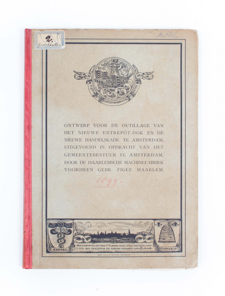 With: Ontwerp voor de Outillage van het nieuwe entrepôt-dok en de nieuwe handelskade te Amsterdam, uitgevoerd in opdracht van het gemeentebestuur te Amsterdam door de Haarlemsche Machinefabriek voorheen gebr. Figee Haarlem, 1899. 63 pp. and 16 folding plates.