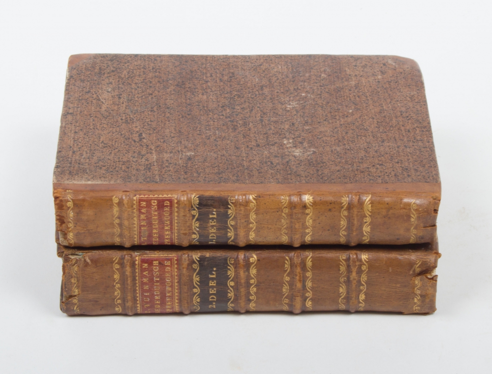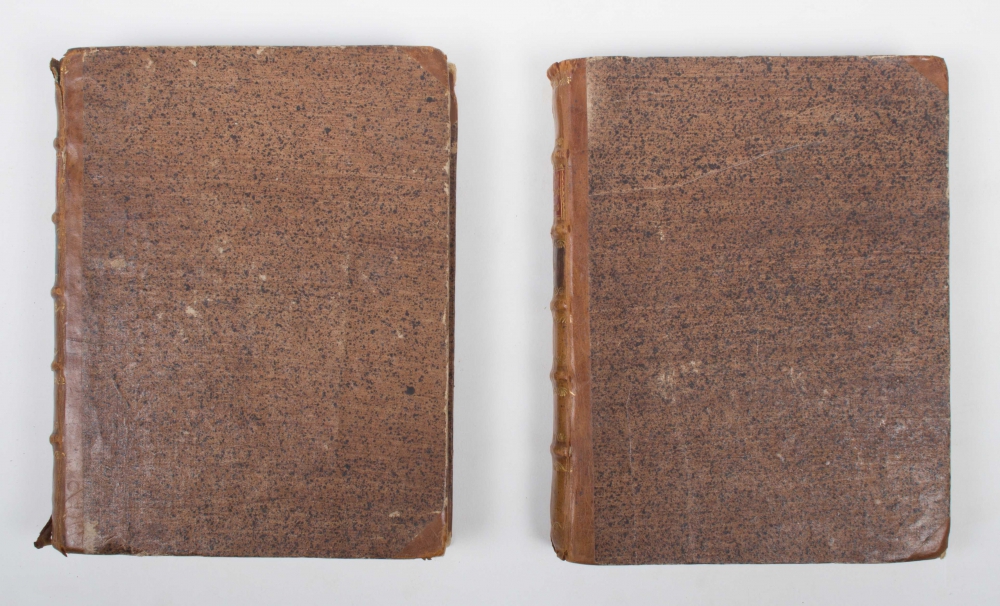 2 volumes uniformly bound, half leather, title in red, black and gilt stamping on spine, frontispiece by F. M. La Cave, 2x title in red and black with 12 different vignettes. In volume 2 separate sections have been added concerning the weather, diseases and health. 2x ex libris and annotations in ms. Spines with sm. dam., interior good.