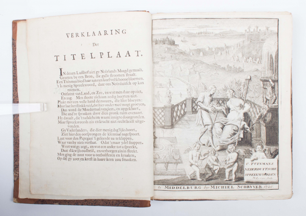 De oorsprong en uitlegging van dagelyks gebruikte Nederduitsche Spreekwoorden, opgeheldert tot grondig verstand der Vaderlandsche Moedertaal. Carolus Tuinman. Middelburg. Michiel Schryver, 1720-1727. 2 volumes, (28),374,(58) and (32),248,(28),54,(2),16,10,66,36,(7) pp.