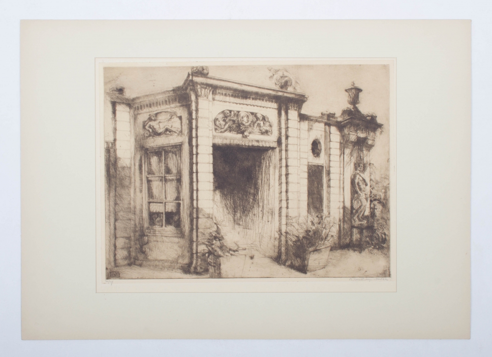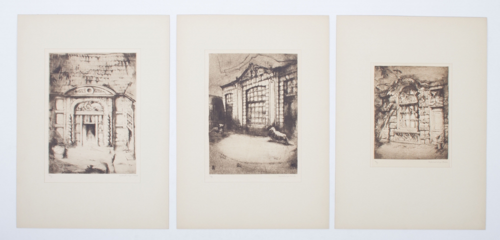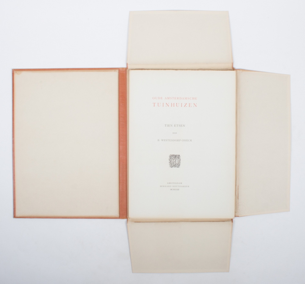 Portfolio (51 x 36 cm.) with title leaf in red and black with vignette. Amsterdam. Bernard Houthakker, 1923. Complete with 10 etchings (27 x 20 cm.) by B. Westendorp-Osieck, all mounted. Of this work, 40 copies were hand-printed, all signed and numbered. No. 7. Portfolio with title, embroidery and arms of Amsterdam in gilt stamping on front board.