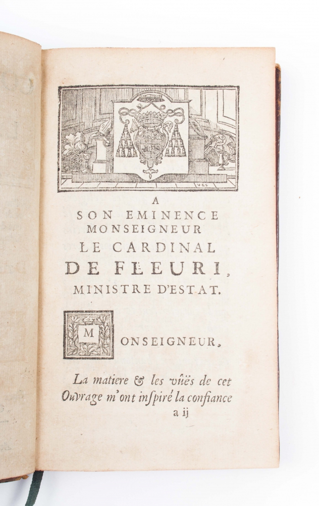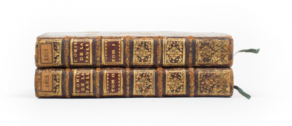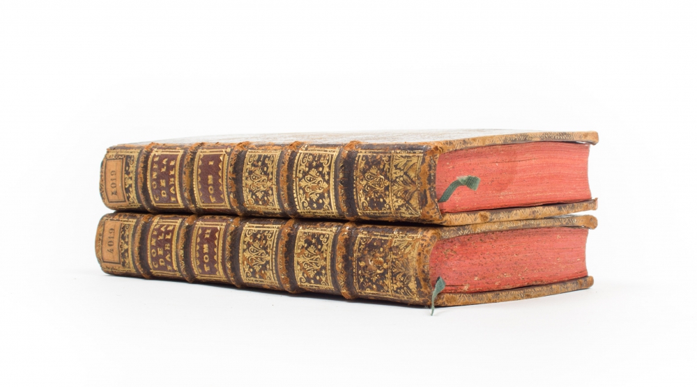 Ou l'on voit que les grandes Fables, le culte & les Mysteres du Paganisme ne sont que des copies alterées des Histoires, des Usages & des Traditions des Hebreux. De Lavaur. Paris. Brunet Fils & Bordelet. 1730. 2 volumes. 12mo, leather, title in red and gilt stamping on spine, marbled endpapers, red edges, ex libris, 2x title with vignette, (14),122,296 and (4),361,(1) pp. Sticker with number on spine. Bindings with minimal traces of use.