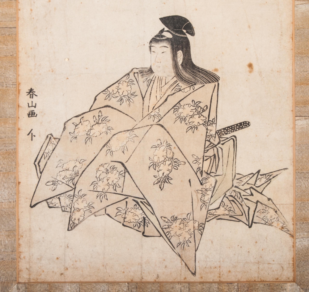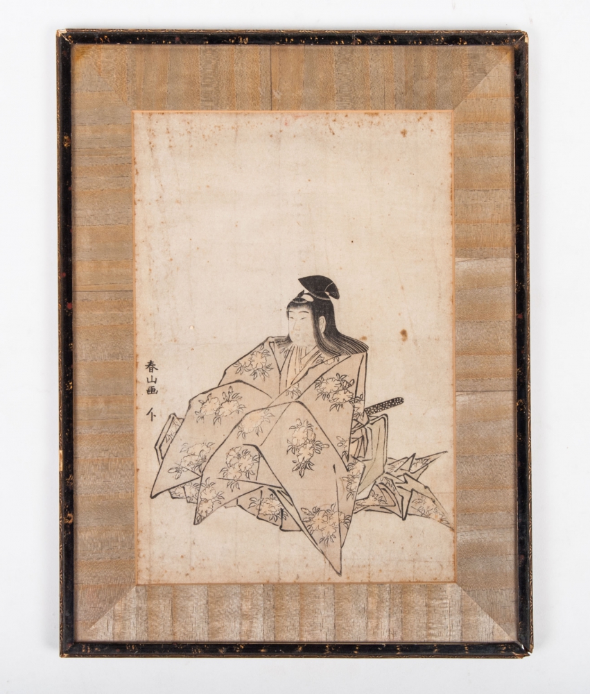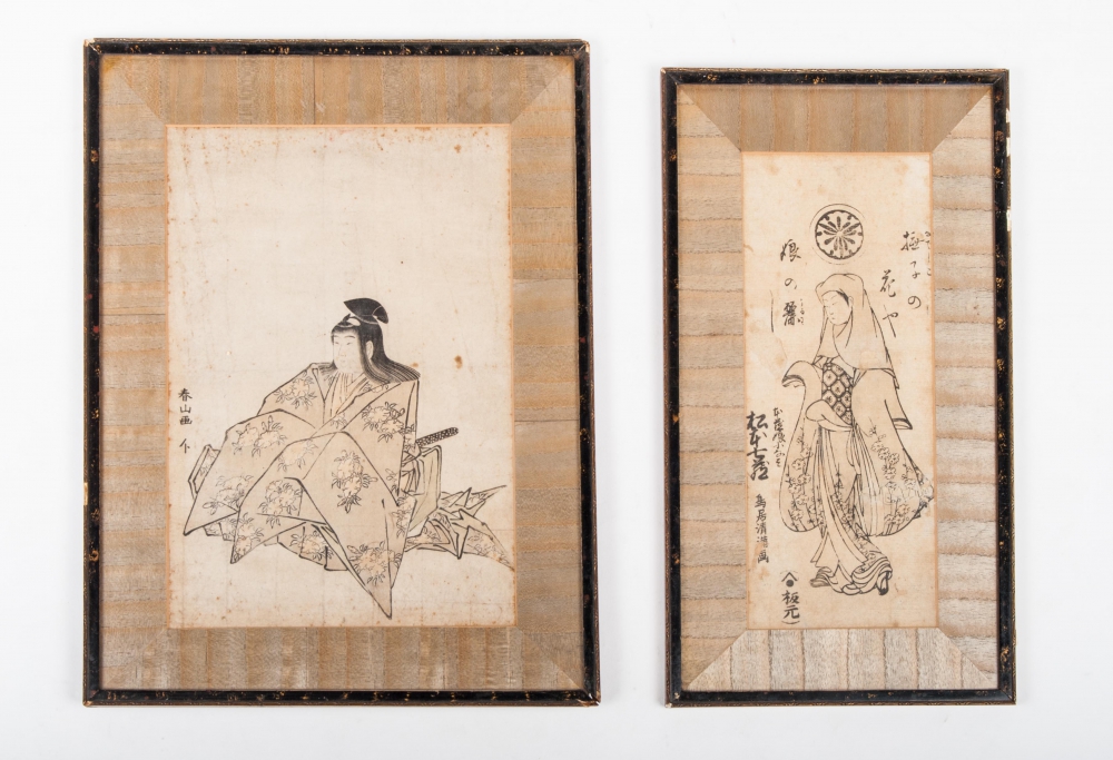 Japanese woodcut. Actor Bando Mitsugoro playing Ukigo Matabei. Signed Gosotei Kunisada ga, publisher Izumiya Ichibei. Censor stamp Kwame, ca. 1835. Oban size + Katsukawa Shunzan (active ca. 1782-1798). A noble. Signature Shunzan ga. Publisher Yamaguchiya Chusuke. Censor stamp Kiwame, ca. 1790-1800. Chuban size.