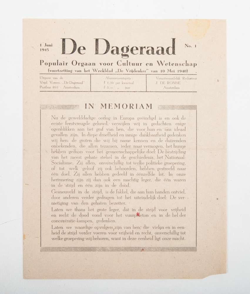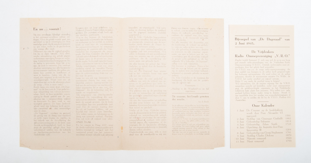 (Voortzetting van het Weekblad "De Vrijdenker" van 10 mei 1940). No. 1-18 [= all]. Amsterdam, Vrijdenkers Vereniging "De Dageraad", 1 June 1945 to 28 September 1945, 18 issues, mostly 4 p. (2-6 each with 8p.), 8vo (to no. 6) and 4to size.