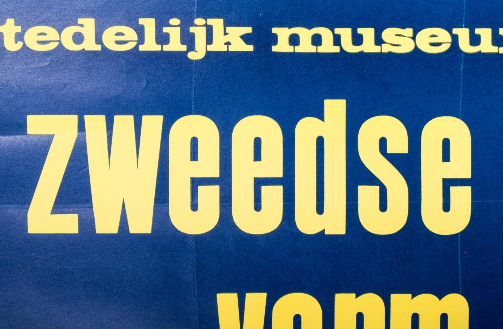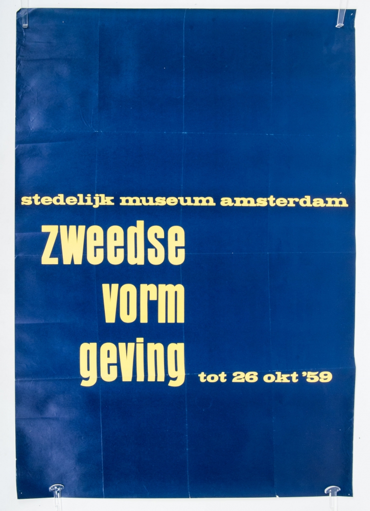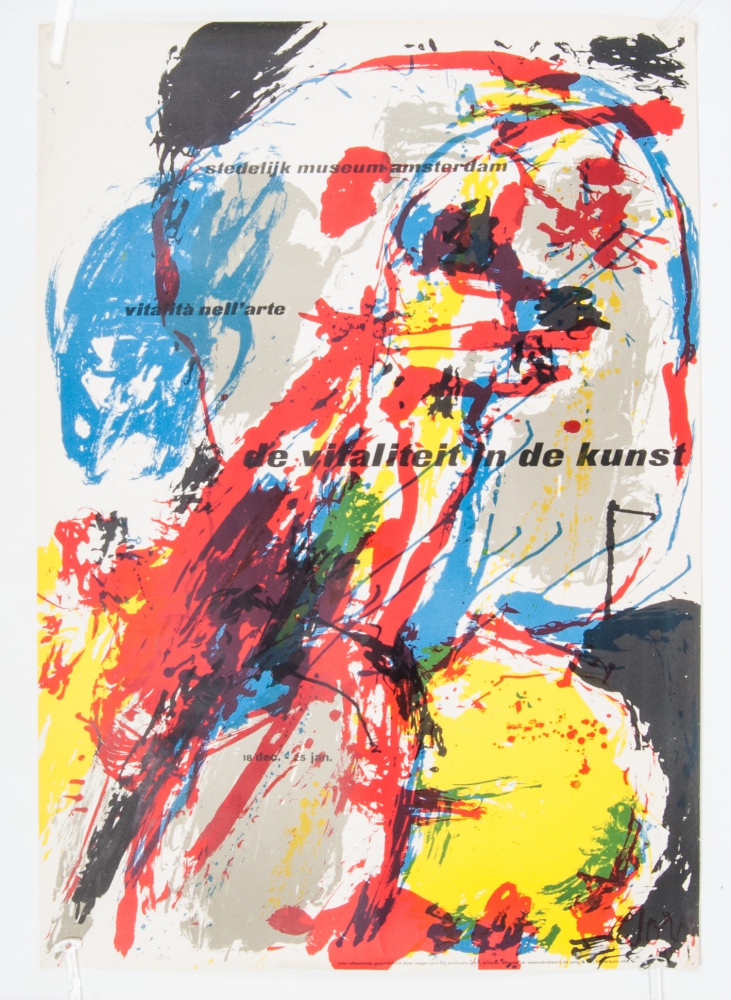 De vitaliteit in de kunst. 18 dec. - 25 jan. Stedelijk Museum Amsterdam. 1959. Lithography/poster, designer Asger Jong. Size 100 x 69.5 cm. Added: Zweedse Vormgeving tot 26 okt '59. Stedelijk Museum Amsterdam. Size 70 x 100 cm. Poster previously folded + leyden. Stedelijk Museum Amsterdam. 6-30 nov 59. Size 70.5 x 99.5 cm. With a fold at the bottom.