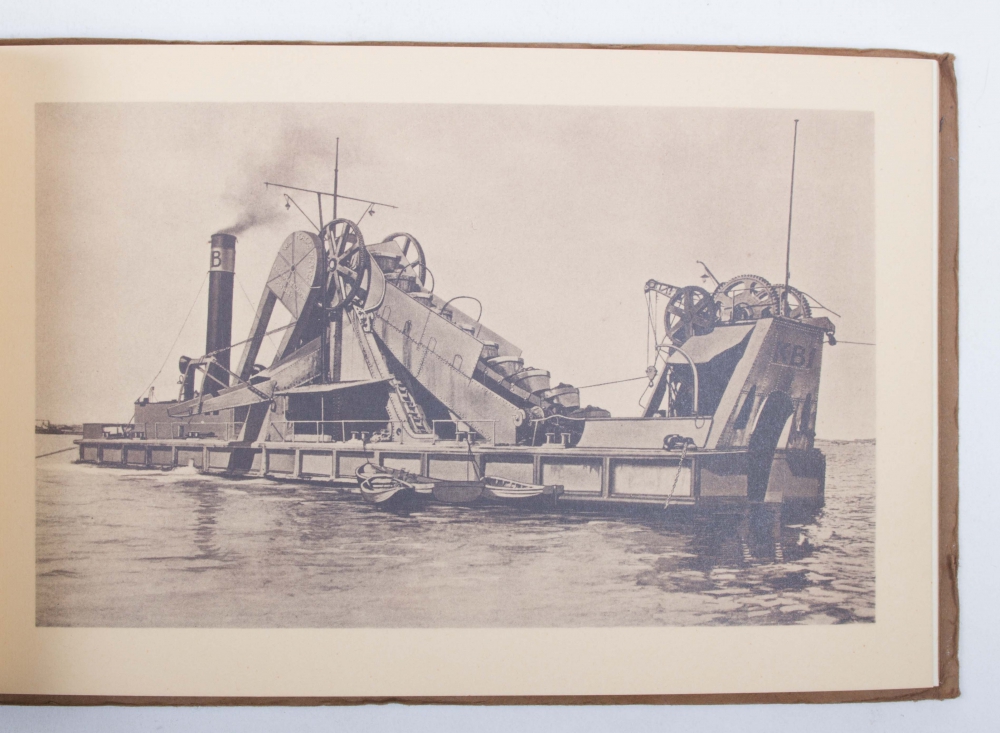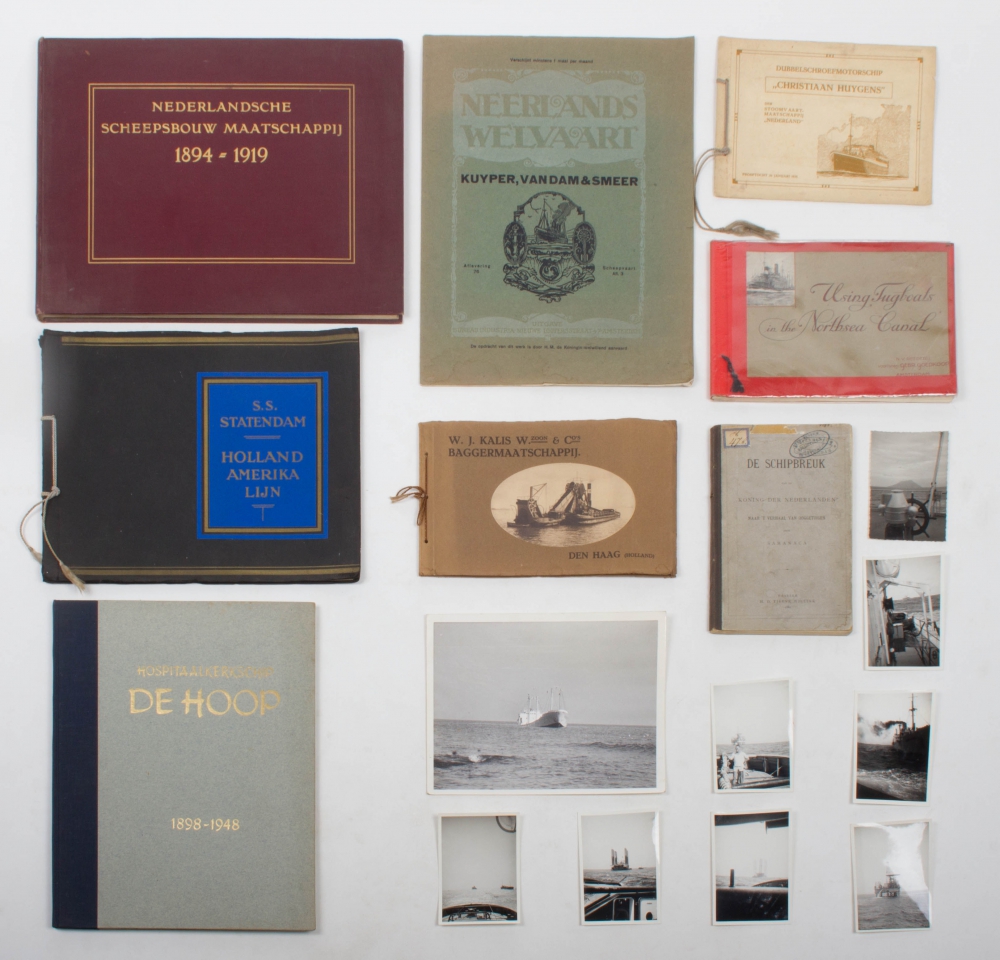 W.J. Kalis W. Zoon & Co's Baggermaatschappij. Den Haag, ca. 1938. Oblong. (34) pp. Cord-bound + Using Tugboats in the Northsea Canal. N.V. reederij voorheen Gebr. Goedkoop, Amsterdam. Ca. 1930. Oblong, in rest. cover + S.S. Statendam. Holland Amerika Lijn. ca. 1930. Cord-bound. Lovely copy - and 5 more. Added: ca. 30 shipping photos.