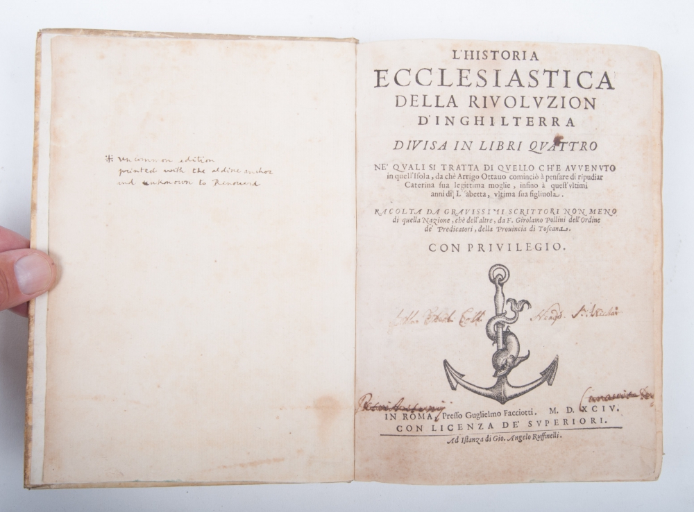 Highly detailed history of England during the time of the Tudors and the English reformation from the contemporaneous Italian view of Girolamo Pollini. Annotations on endpaper and title leaf, water stains and "old-book smell". Shabby but complete and interesting copy.