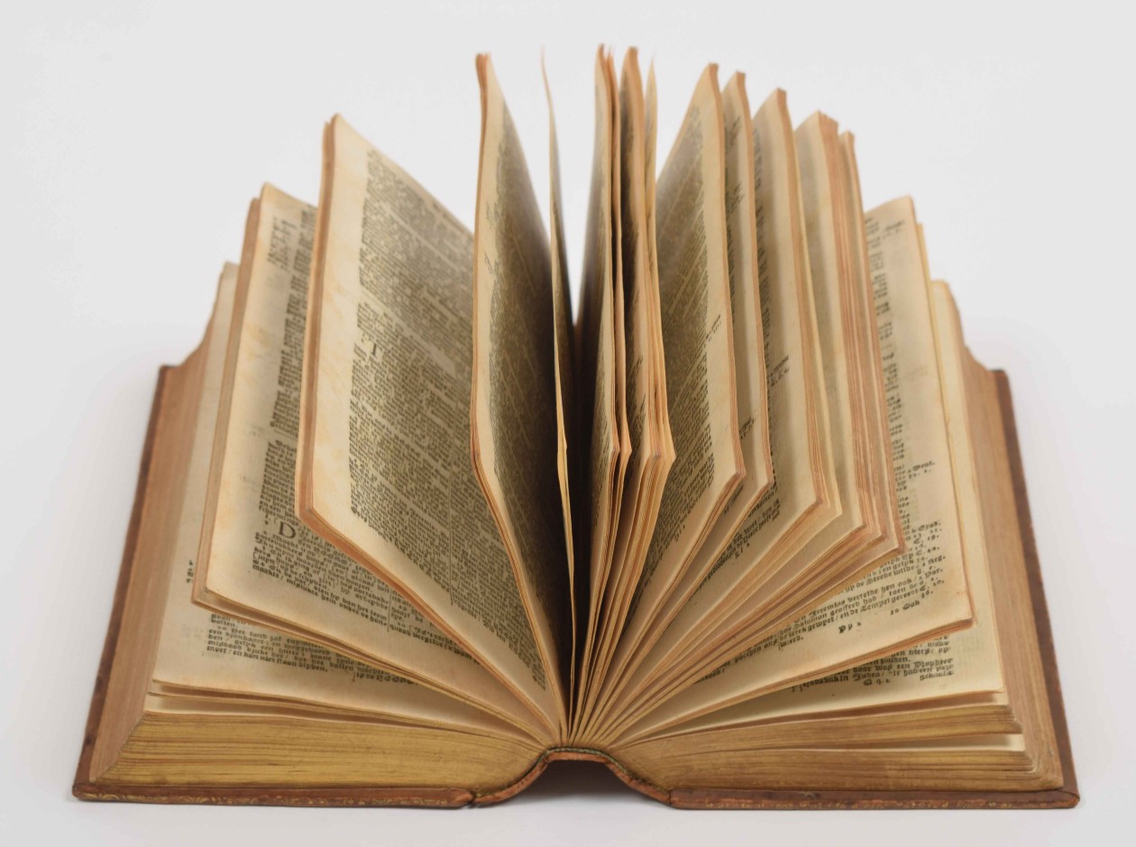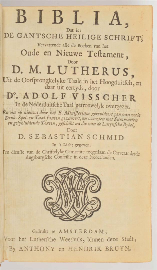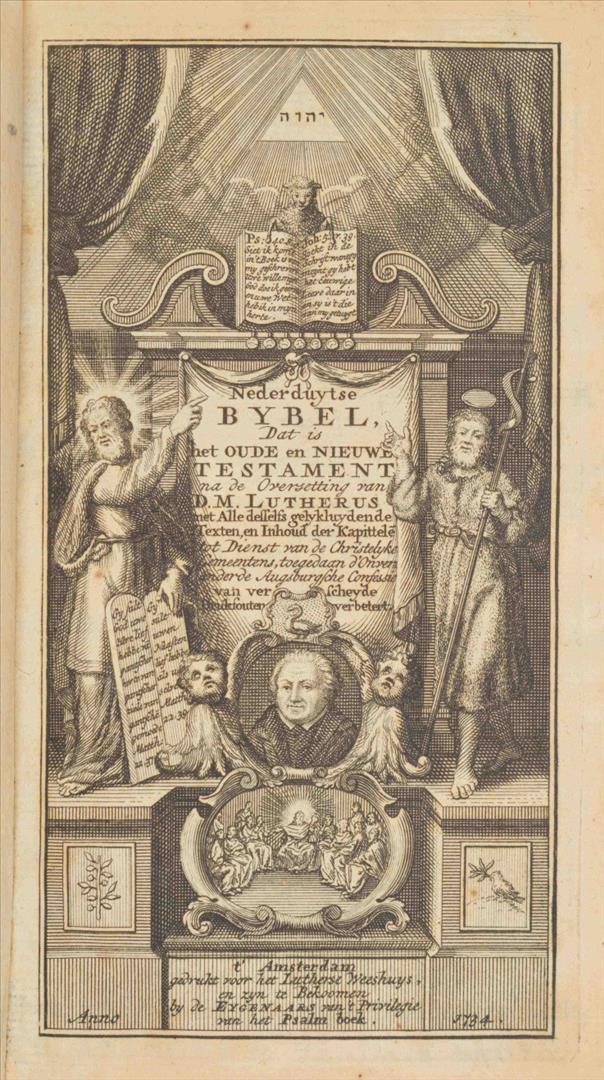 Illustrated frontispiece with title: Nederduytse Bybel. Dat is het Oude en Nieuwe Testament na de oversetting van D.M. Lutherus met alle desselfs gelykluydende texten en inhoud der Kapittele[n]. Amsterdam, Gedrukt voor het Lutherse Weeshuis, 1734. Second title: Biblia dat is de gantsche Heilige Schrift; vervattende alle de boeken van het Oude en Nieuwe Testament. D.M. Lutherus (trsl.) Do. Adolf Visscher (...) opnieuw gerevideert D. Sebastian Schmid. Amsterdam, Anthony & Hendrik Bruyn. Also title pages for Het Nieuwe Testament and De Psalmen.