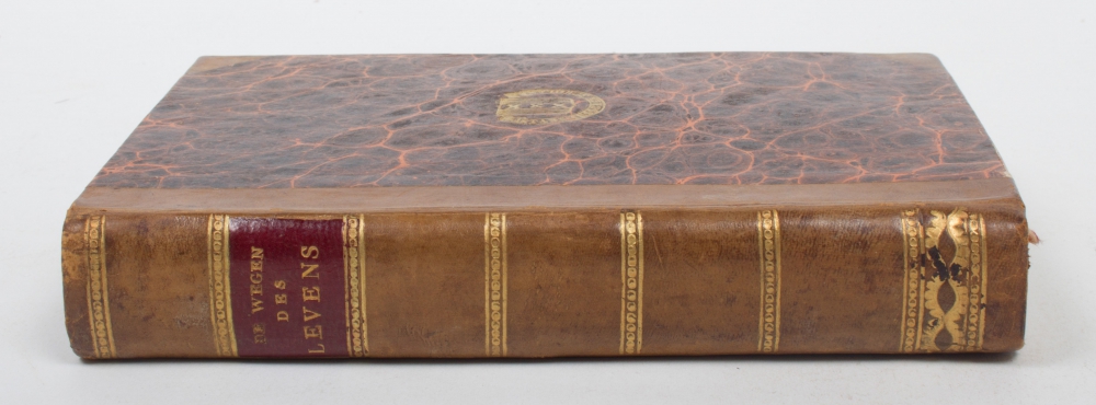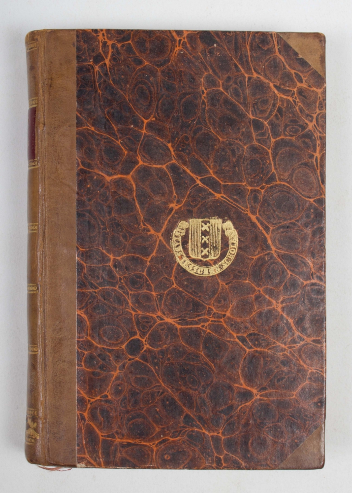 Small 8vo, title on spine in red and gilt stamping, boards with arms of Amsterdam and name "Stads tusschenschool" on front and back cover. Front of book with added a proof of good behaviour and proven diligence: Buitengewone Eere-Prijs van de 3e klasse (for) Gezina Bernbeek. Amsterdam. 1828. Title with illustration by D. Veelwaard, 278 pp., 9 full-page copperplates.