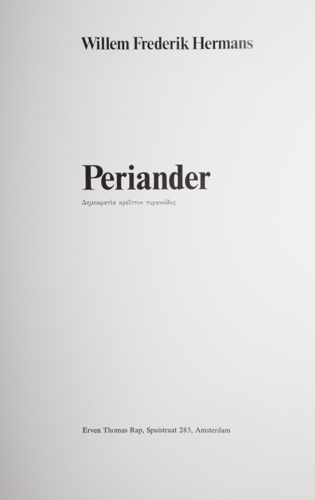 Periander. Thomas Rap, Amsterdam, 1974. 52 pp. Half leather with cloth boards, in perspex cassette. No. 63/120. Signed.