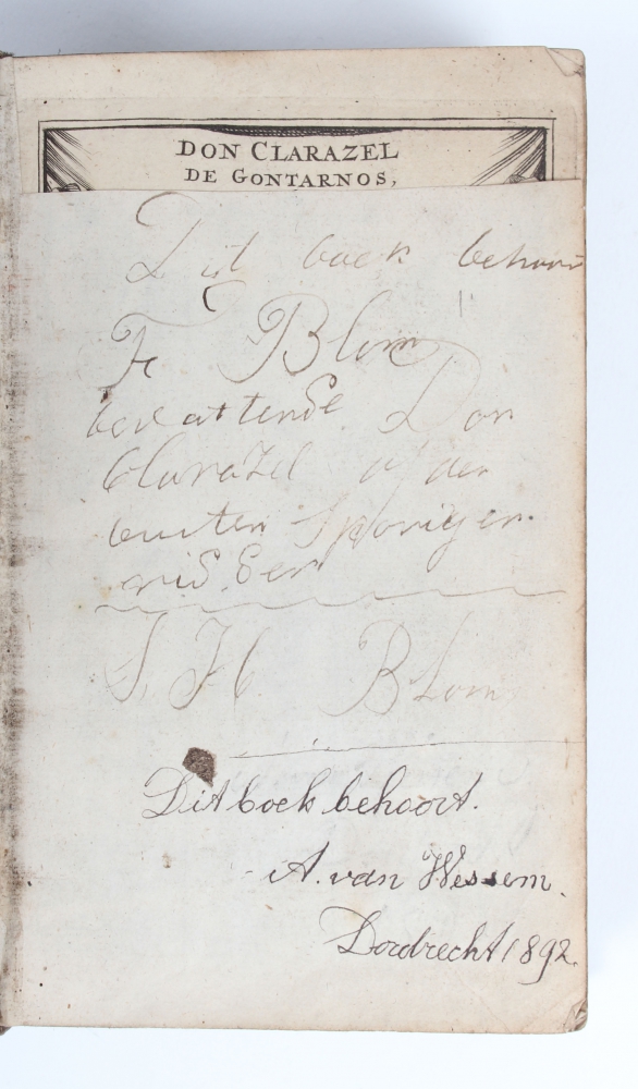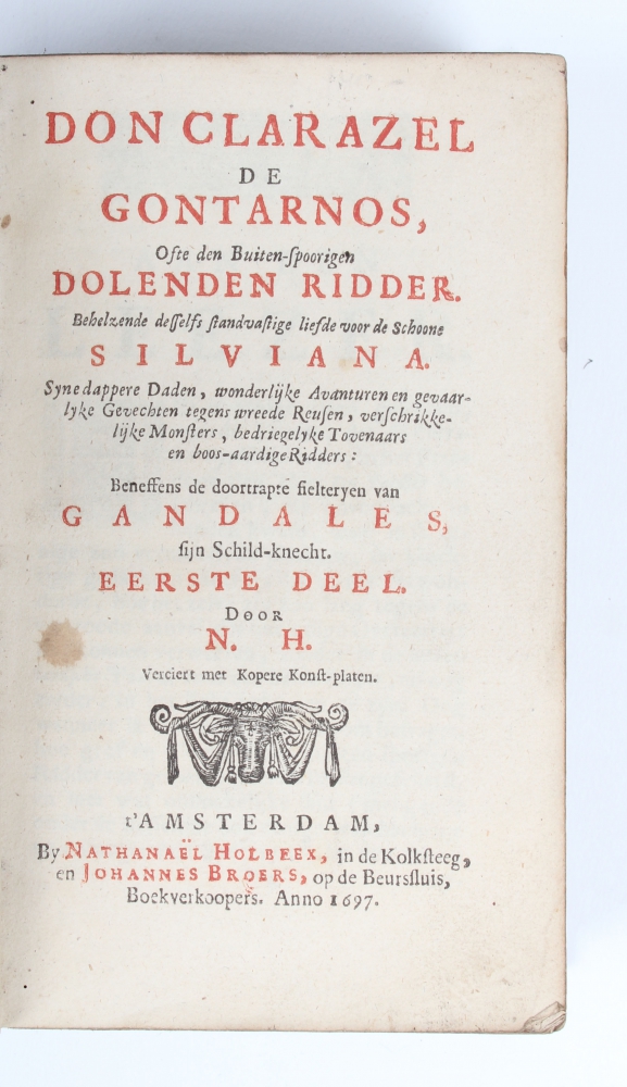 Novel in Don Quichotte-style. Dutch edition of Gilbert Saulnier Du Verdier; Le chevalier hipocondriaque (1632). Binding dam. on spine ends. On first two endpapers annotations and name of 19th-century owners.