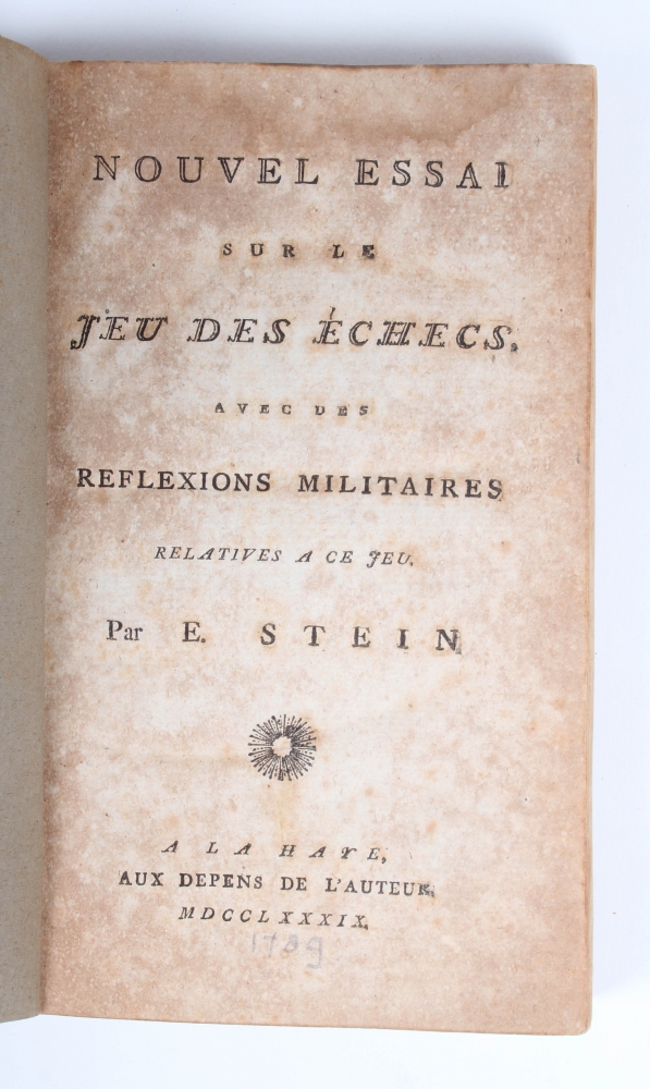 avec des Reflexions Militaires relatives a ce Jeu. Par E. Stein. The Hague, private press, 1789. (8), x, 254 pp. 4to, in later half cloth binding.