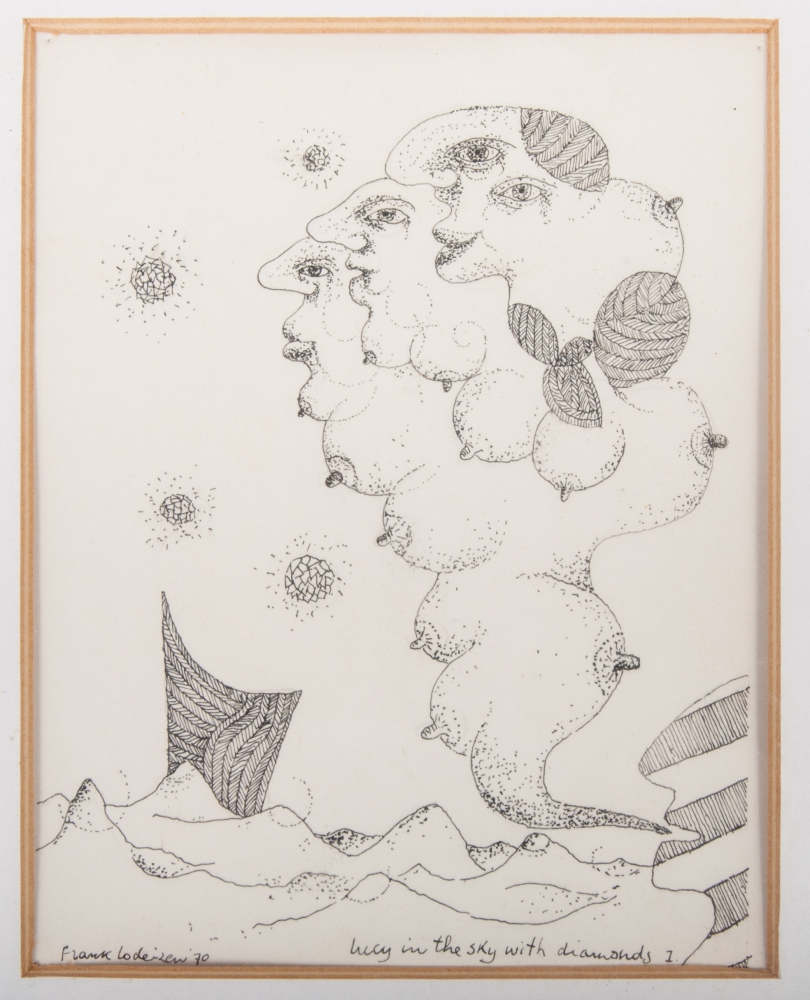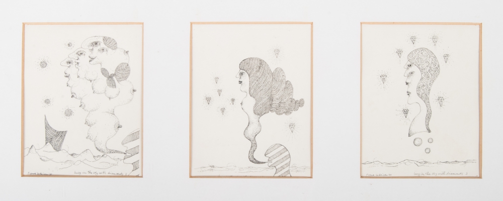 Tryptich Lucy in the Sky with Diamonds. India ink. Commissioned by Holshuysen and Stoeltie Diamantairs in Amsterdam, ca. 1970. Each 13.5 x 10.5 cm. Mounted in frame under glass. And: another work (artists unknown) from the series of works commissioned by the diamond trader that year from famous artists of the time.
