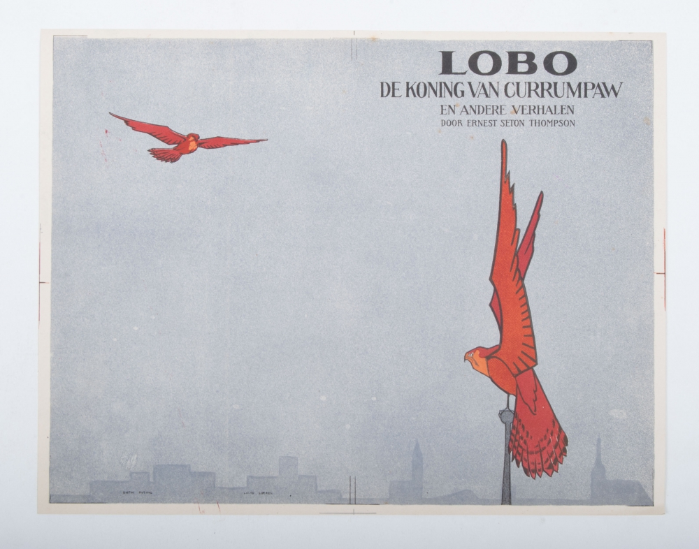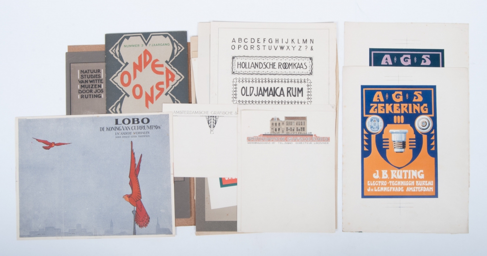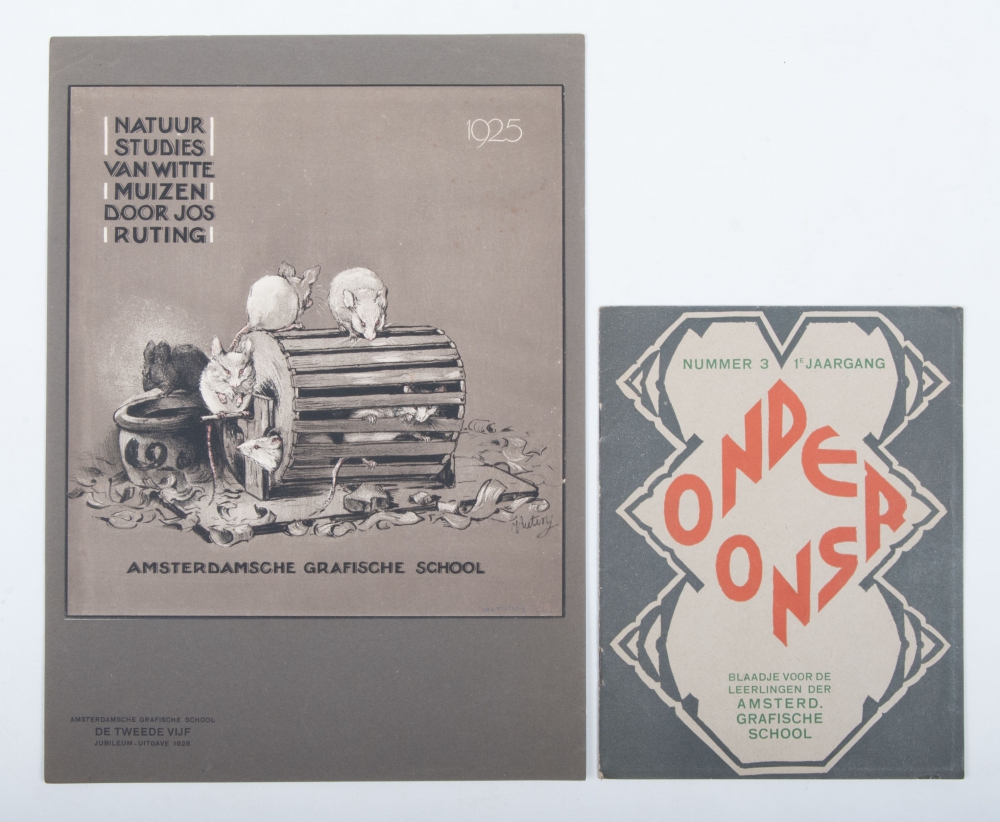 Natuur studies van Witte Muizen door Jos Ruting. Amsterdamsche Grafische School. From "De tweede Vijf", Jubileum-Uitgave 1928. Lithography, unaffixed to paper, 24 x 22 cm. + Lobo de koning van Currumpaw en andere verhalen door Ernest Seton Thompson. Lithography proof for the cover. 24 x 31 cm. + A.G.S. Zekering. J.B. Ruting Electro-Technisch Bureau, proof design in 3 colour variants, ca. 1928 + cover design Vogels en Vogel-zorg, prof. Piet Vogelenzang. Design J. Ruting, lithography J.H. Kijser, 1925. 20 x 29 cm. + 10 various proof designs and originals + Onder Ons. Blaadje voor de leerlingen der Amsterdamsche Grafische School. No. 3, 1st volume, 1922. 16 pp. Cont. some early bird drawings of the then 13-year old Ruting.