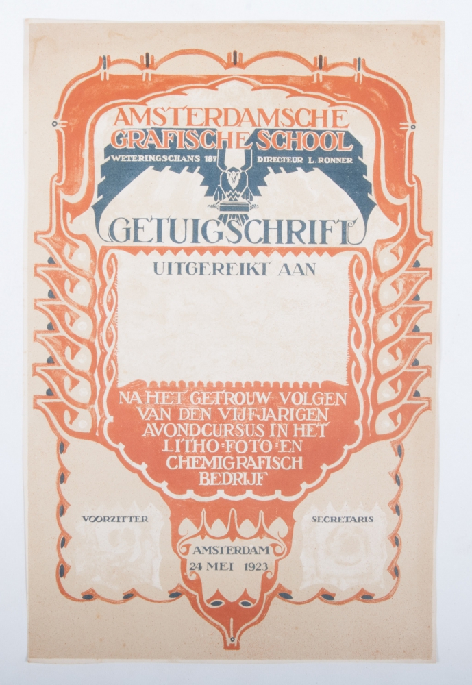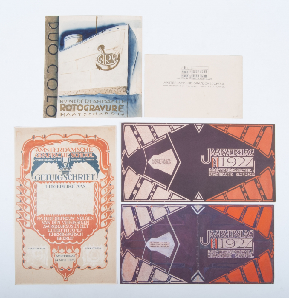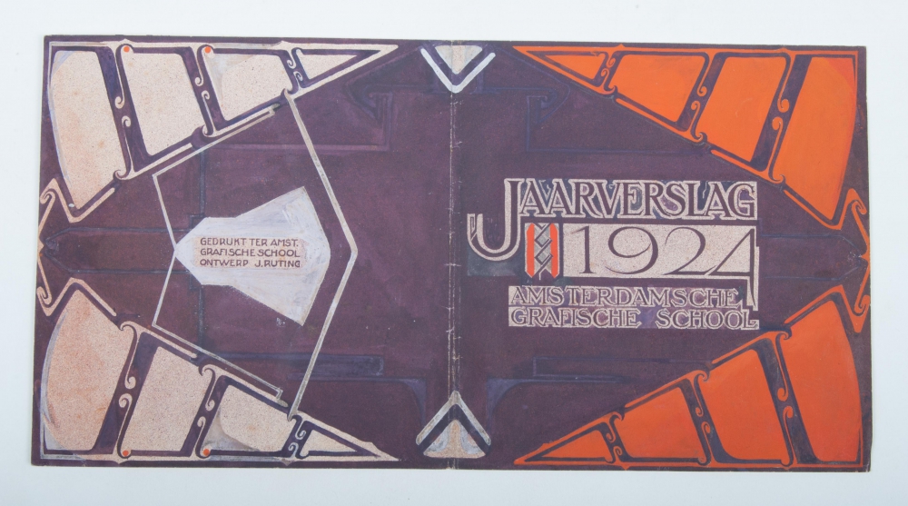 Jaarverslag 1924 Amsterdamsche Grafische School. Lithographic cover, design J. Ruting. Unfolded copy + the original in watercolour. Both 24 x 39 cm. + proof design Duo Colo, NRM NV Nederlandsche Rotografure Maatschappij. Watercolour, 26.5 x 25 cm. + proof Amsterdamsche Grafische School Getuigschrift 24 mei 1923 - and 1 more.