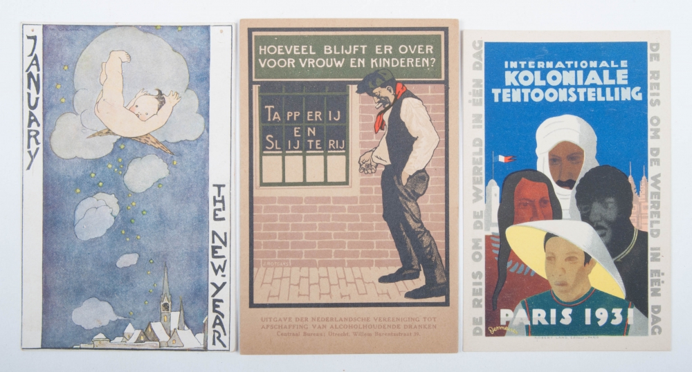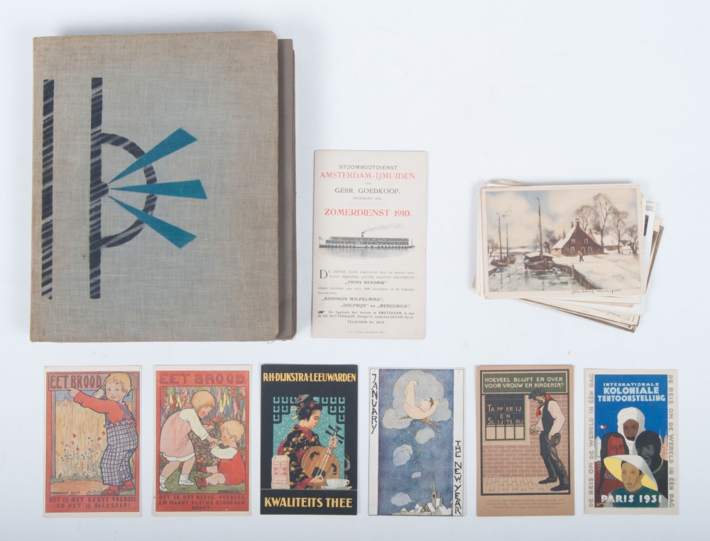 With ca. 250 picture postcards of birds, most drawn, all pre-1950 - and 34 separate miscellaneous cards, incl. "Eet Brood", 2 variants by Rie Cramer and Internationale Koloniale Tentoonstelling Paris 1931 - and a rate card of Stoombootdienst Amsterdam-IJmuiden van gebr. Goedkoop, zomerdienst 1910.