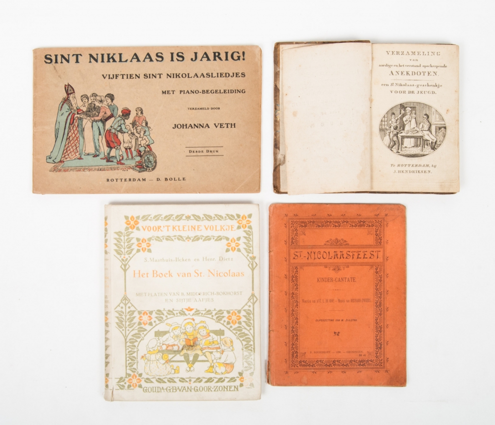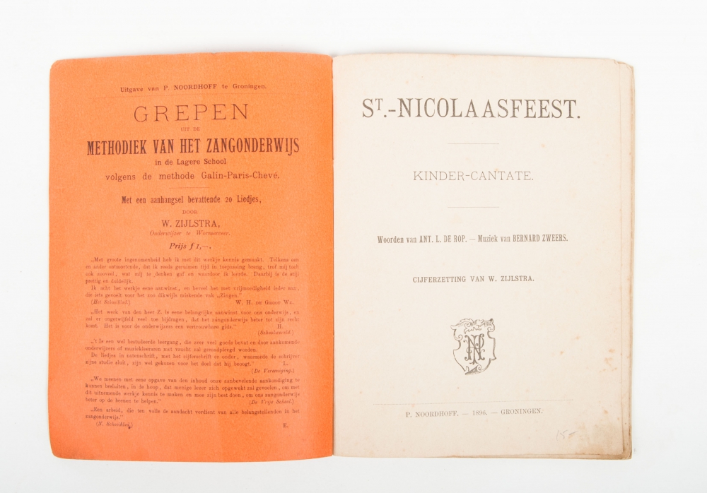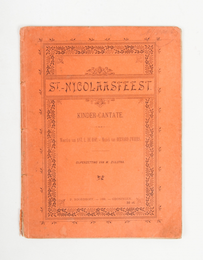 St.-Nicolaasfeest. Kinder-Cantate. Groningen, F. Noordhoff, 1896. 39, [4] pp. Original orange cover. Good condition; cover damaged on spine, a few dog ears. With 3 more.