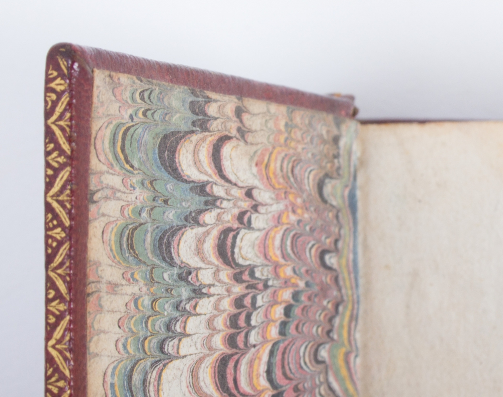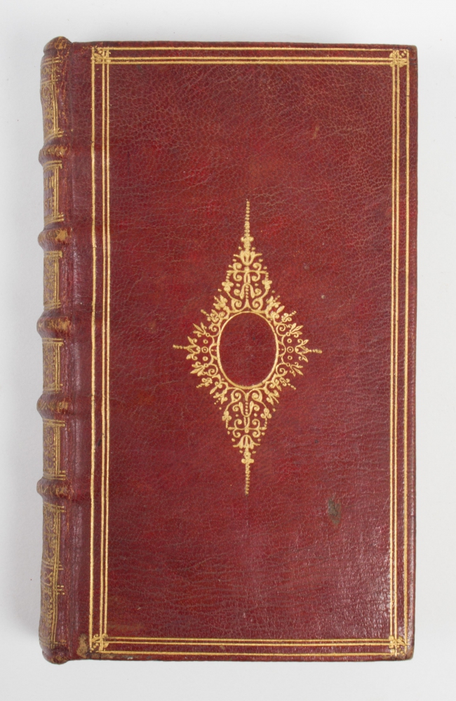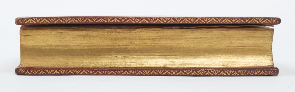 both boards with centered diamondshaped gilt stamp and with triple line border, ribbed back with 6 gilt compartments, edges of boards and all edges gilt, 12mo.