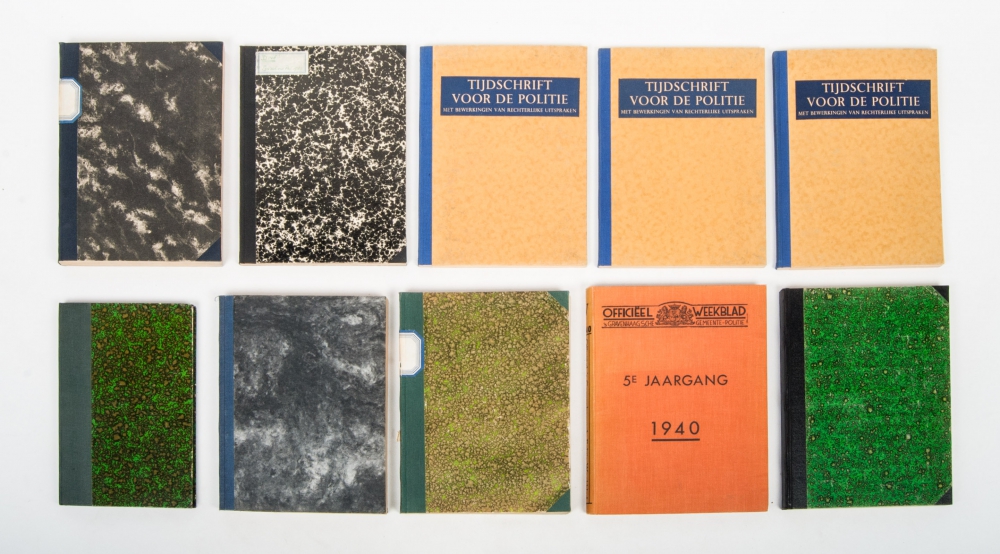 With: Officieel Weekblad voor de 's Gravenhaagsche Gemeente-Politie 5th volume 1940 (52 volumes in one binding, original cloth, 4to), and finally with Tijdschrift voor de Politie Vol. 12-19 (Leiden, 1950-1957, in 8 various bindings, 4to).