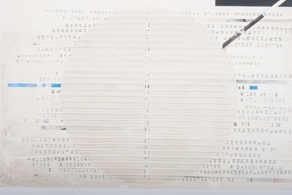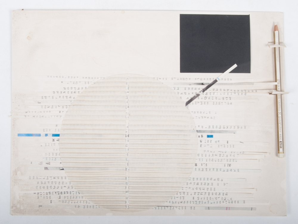 "Schwebzeile", 1969. Construction/montage with pull-strips, note block, Decoro pencil on cardboard, secured in a box. Edition of 55, all unique. Signed and numbered, this is no. 12. Size 26 x 27 x 2.5 cm. Box 1 with notch on one side, cardboard slightly stained. Else intact.