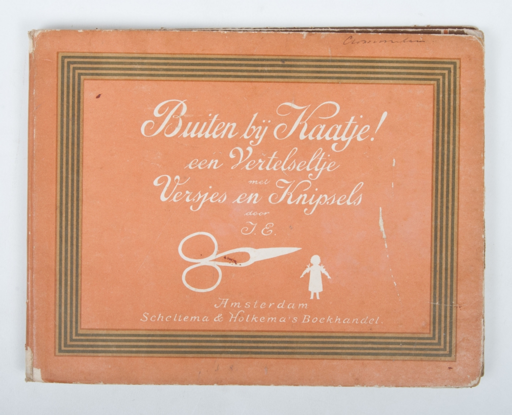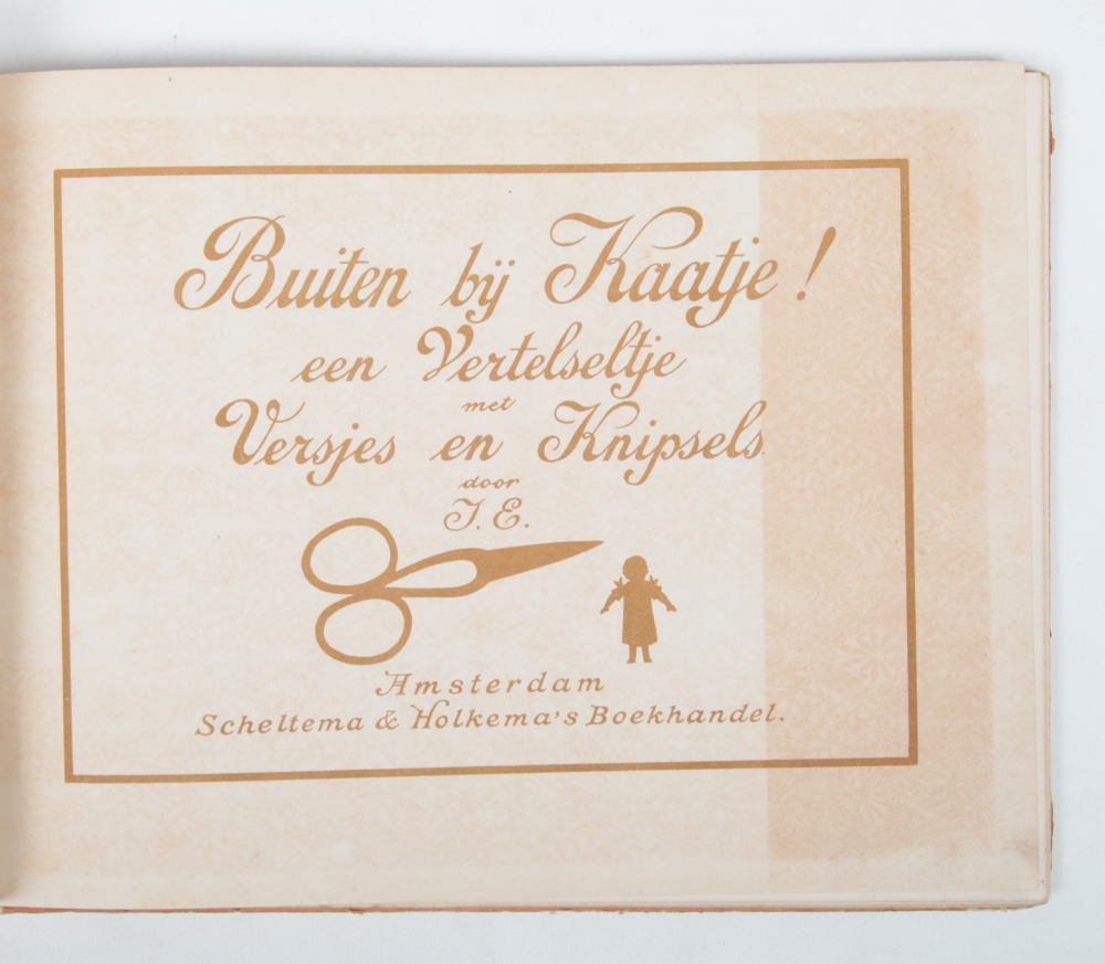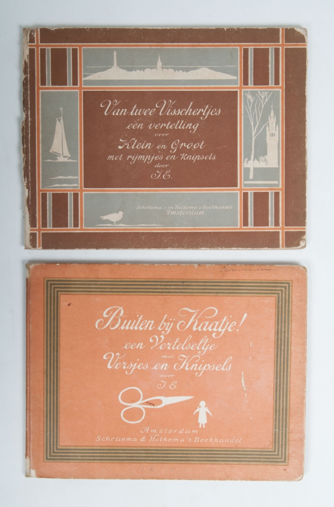 Een vertelseltje met versjes en knipsels door J.E. Amsterdam, Scheltema & Holkema, [1912]. Oblong 25.5 x 33 cm. 28 pp. Original cardboard binding. With: Van twee visschertjes. Een vertelling voor klein en groot met rijmpjes en knipsels. Amsterdam, Scheltema & Holkema, [1913]. Oblong 25.5 x 33 cm. 28 pp. Original cardboard binding. Both in fairly good condition; spines damaged.