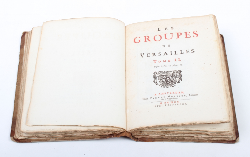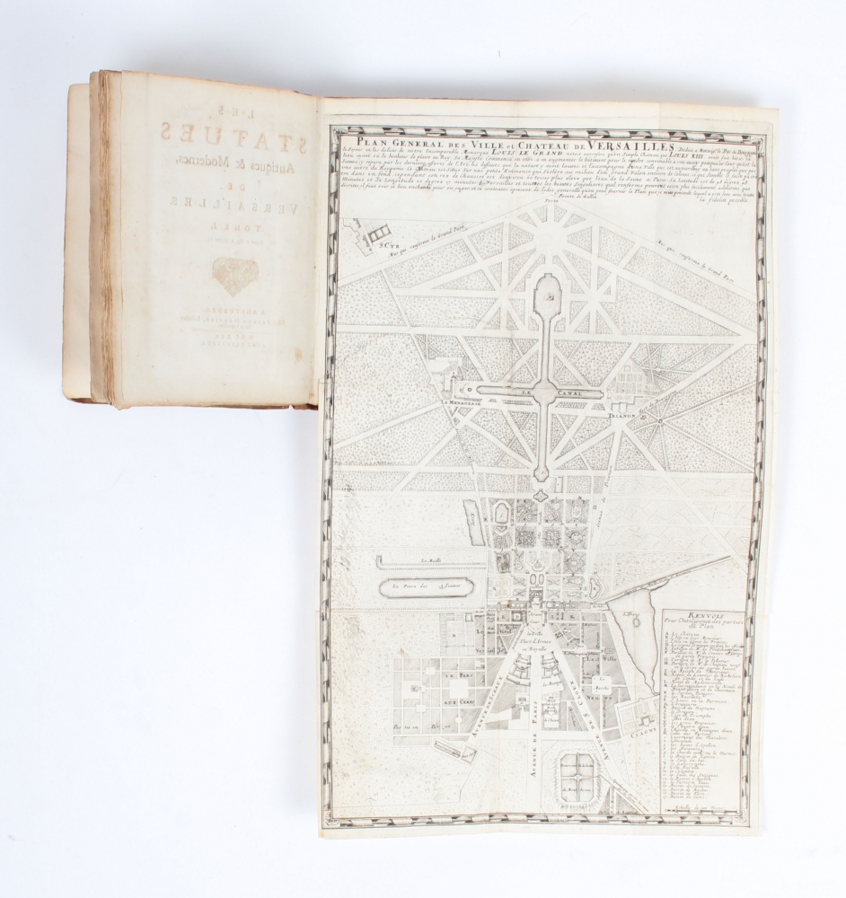 Et Autres Ornemens de Versailles. Tels qu'ils se voyent à present dans le Chateau & Parc. Gravé d'apres les Originaux Par Simon Thomassin, Graveur du Roy. Le tout en quatre Langues. François, Latin, Italien, & Flaman. Amsterdam, P. Mortier, 1695, 59 text p., general title page and 4 subtitles in red and black, with engraved frontispiece, large folding plan and 218 engraved plates (5x folding), contemporary half calf, ribbed and gilt back with morocco title shield, 4to.