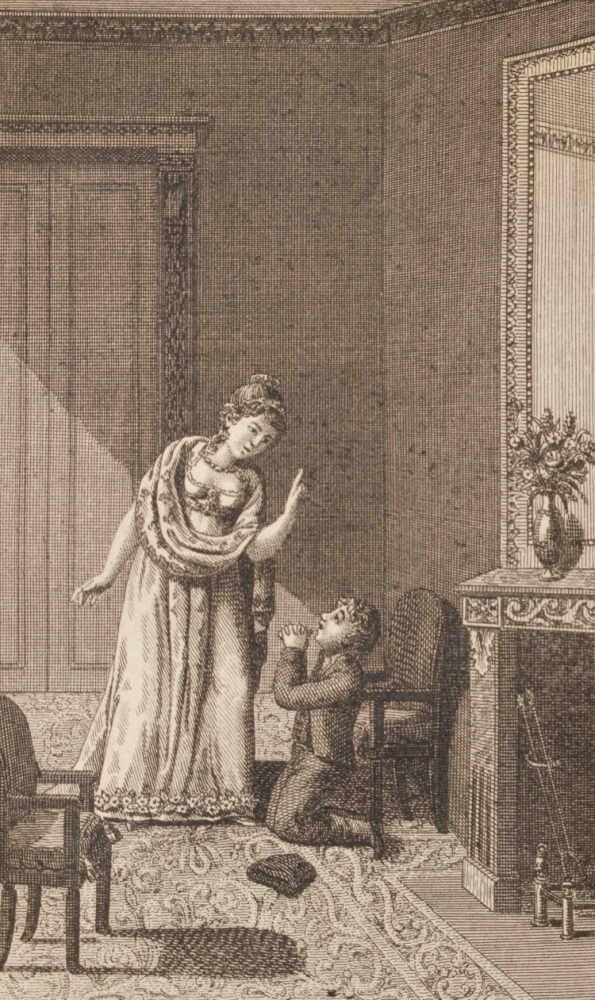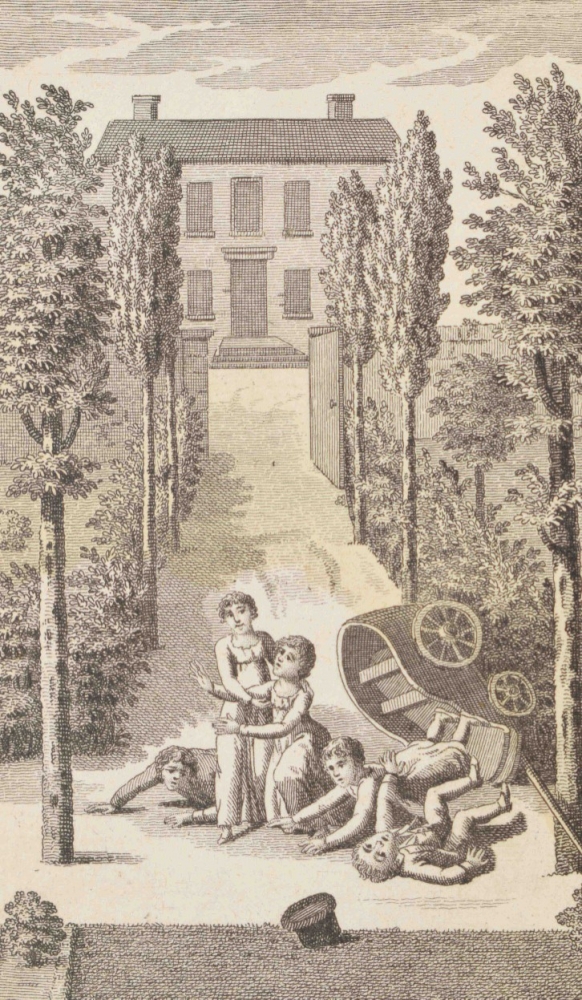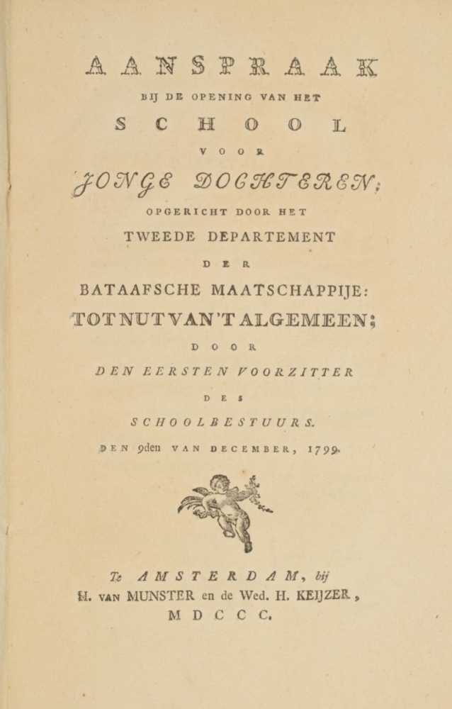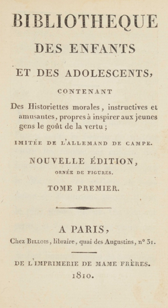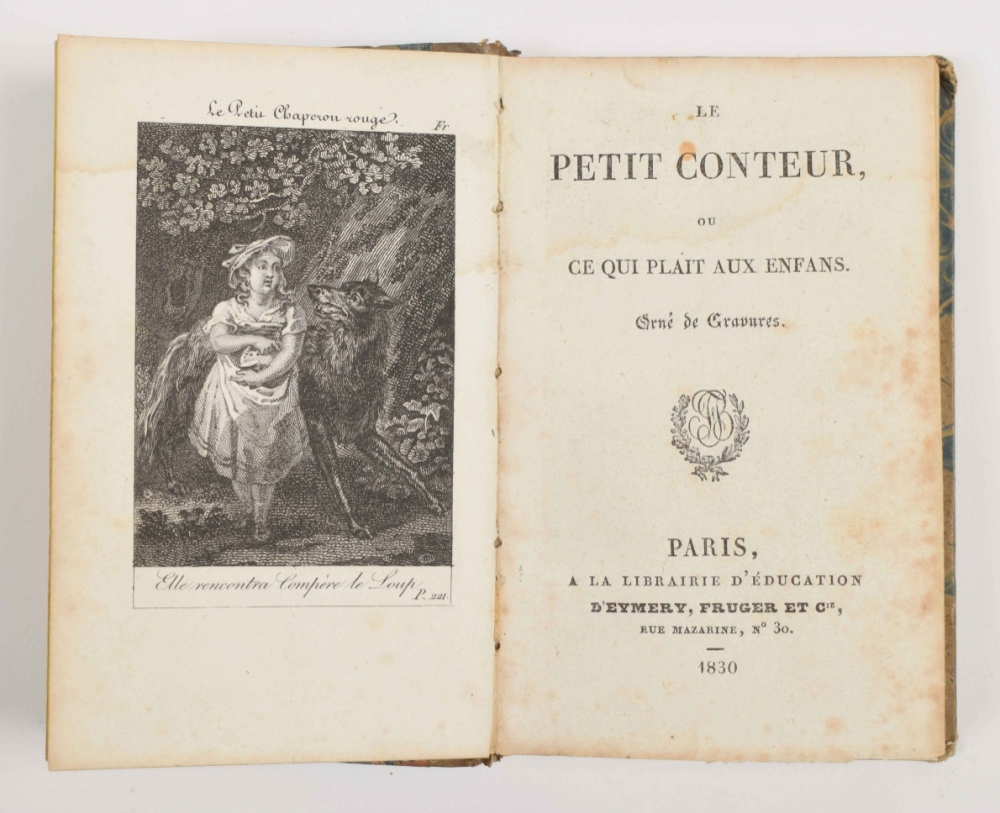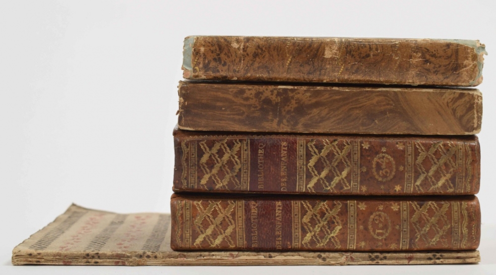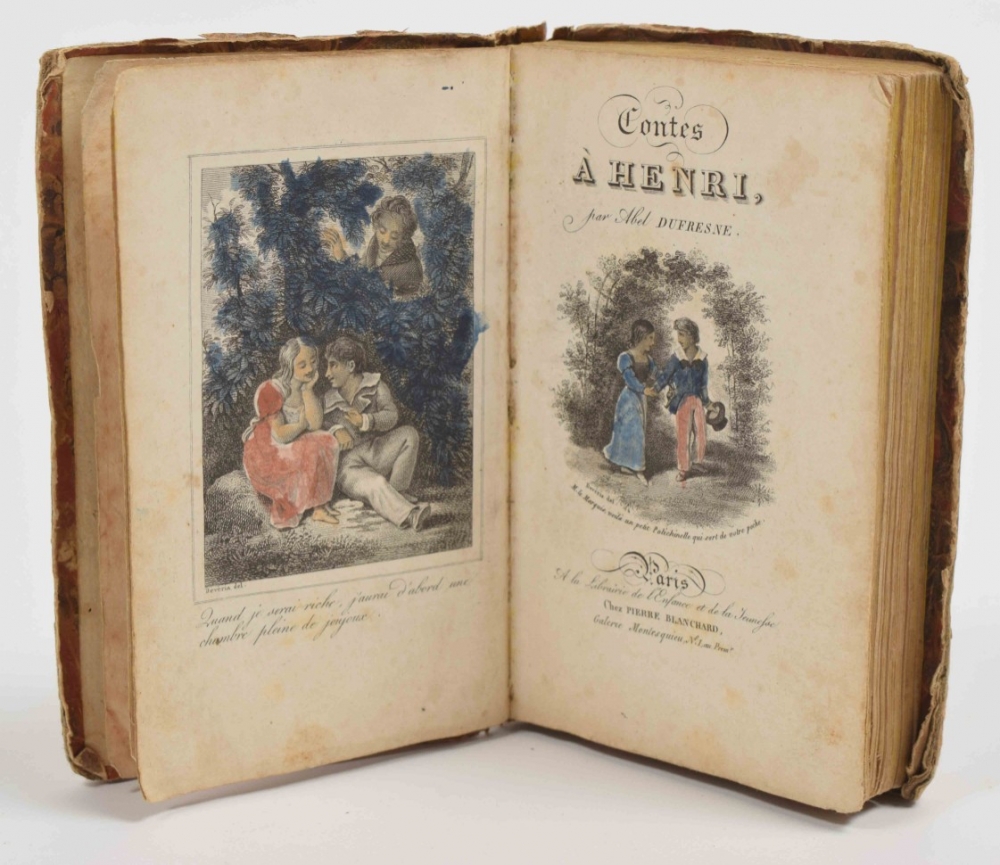 contenant des historiettes morales, instructives et amusantes, propres à inspirer aux jeunes gens le goût de la vertu. No author. Paris, Billois, 1810. 4 parts in 2 vols. vii, 198, 172, (2); 210, 171, 6 pp. Engraved frontispiece and 16 full-p. engravings. Calf, profusely gilt spine with mor. letterp., boards with gilt supralibros "Leer en Kweek sch: voor jonge dochteren, Amst: tweede dep: tot nut van 't algemeen.", 8vo. Vol. 1 with small water stain in upper margin, vol. 2 with mild waterst. + Aanspraak bij de opening van het school voor jonge dochteren, opgericht door het tweede departement der Bataafsche Maatschappije tot Nu van 't Algemeen. Amsterdam, H. van Munster & wed. H. Keijzer, 1800. 56 pp. Orig. wrappers, large 8vo + Contes à Henri. Abel Dufresne. Paris, Pierre Blanchard, 1825. 211 (incorrectly numbered) pp. Engraved frontispiece and title page, full-p. engravings. Publisher's catalogue bound at the front. Marbled paper binding, small 8vo. Binding worn, sl. foxed - and 1 more.