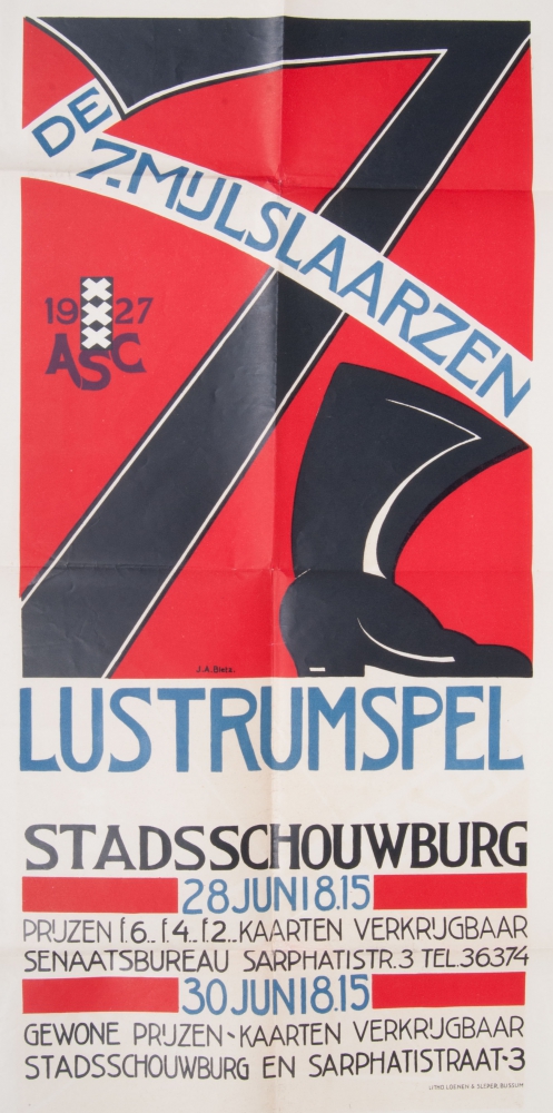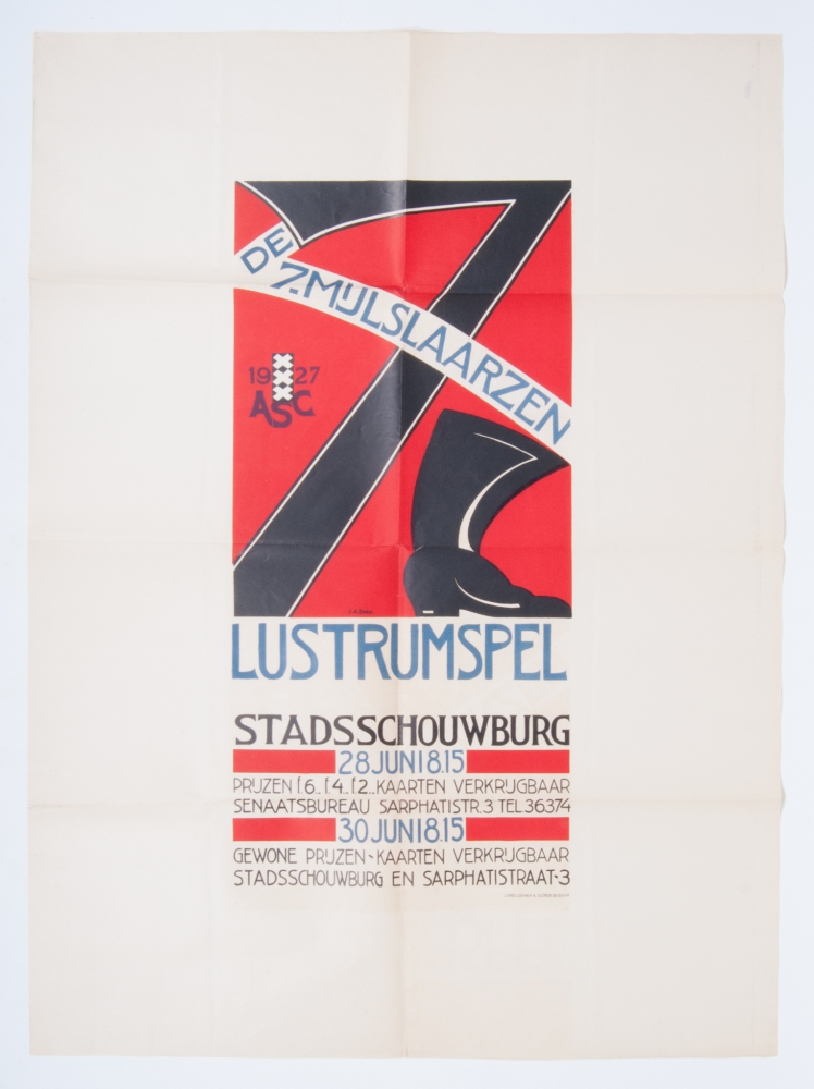 Design J.A. Bletz. ASC 1927, Lustrumspel. Stadsschouwburg 28 juni t/m 30 juni. Litho Loenen & Sleper, Bussum. 110 x 80 cm.