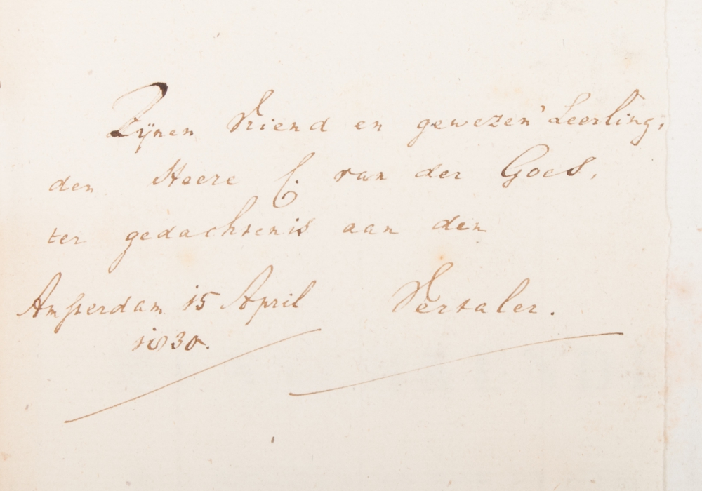 With in volume 1 a dedication by the translator in pen on free endpaper, dated "Amsterdam, 15 april 1830". Additionally in both volumes an unidentified heraldic owner's stamp on the subtitle. With another 3 in 4 volumes, all in contemporary cardboard with original letterpress title shield, incl. Herinnering aan J.H. Nieuwold, door H.W.C.A. Visser (Sneek, voor rekening van den Schrijver bij F.W.V.B Smallenburg, 1814) and Nagelatene verhandelingen van den heer J.H. Nieuwold (...) uitgegeven door H.W.C.A. Visser (Amsterdam, 1822, 2 volumes).
