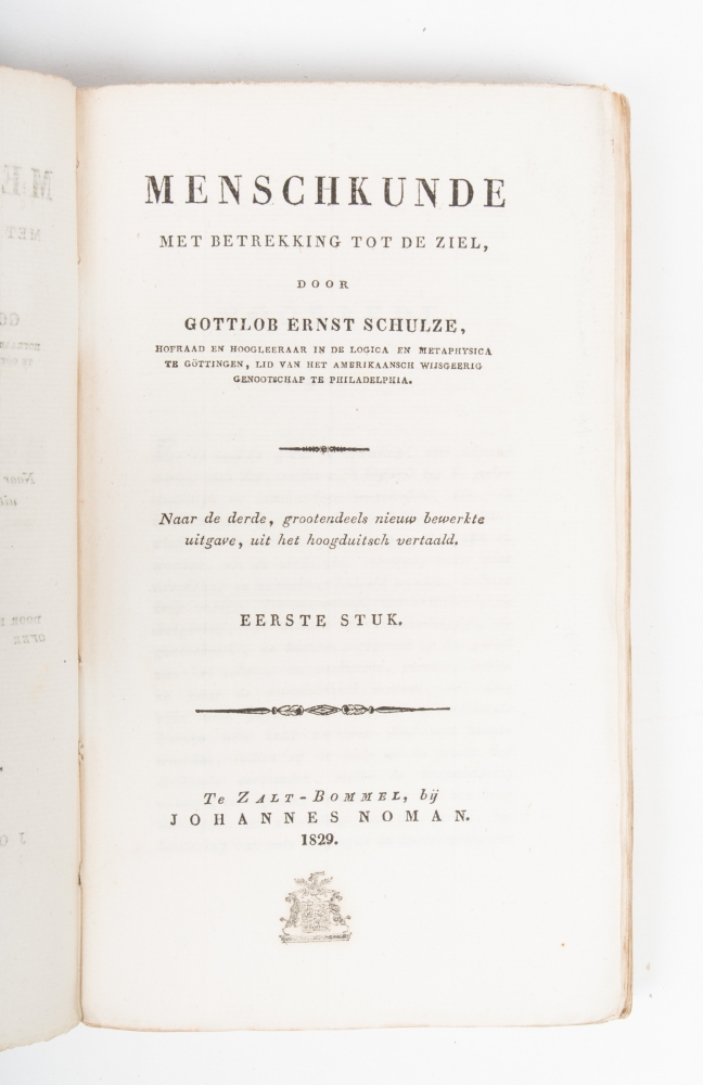 door Gottlob Ernst Schulze. Naar de derde, grootendeels nieuw bewerkte uitgave, uit het hoogduitsch vertaald. Voorafgegaan door eene voorrede en eene verhandeling over de werking van de terugroepende verbeeldingskracht, van J.F.L. Schröder. Zalt-Bommel, J. Noman, 1829, 2 volumes, CXII,235,(4); (3),238-533,(3)p., contemporary cardboard with original letterpress title shield.