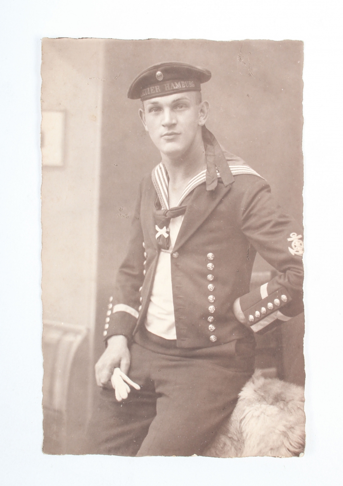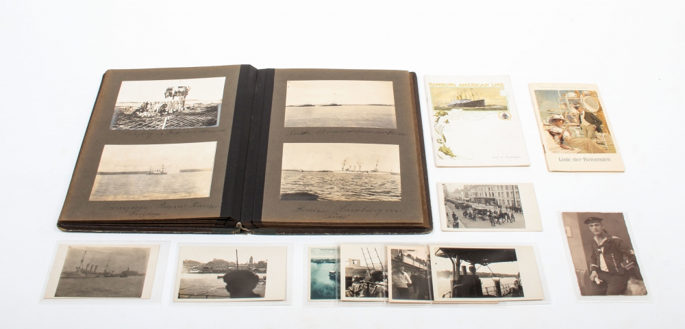 1904/1905. Photo album with 84 photos of the voyage to the north undertaken by the Hamburg as escort ship for the Imperial yacht Hohenzollern. With photos of the voyage, rendezvous with the Russian navy and local population. Separately added: 8 cards of Kreuzer Hamburg from the '20s, partly written, and 2 passenger books of the Hamburg-American Line, 1910 and 1912.