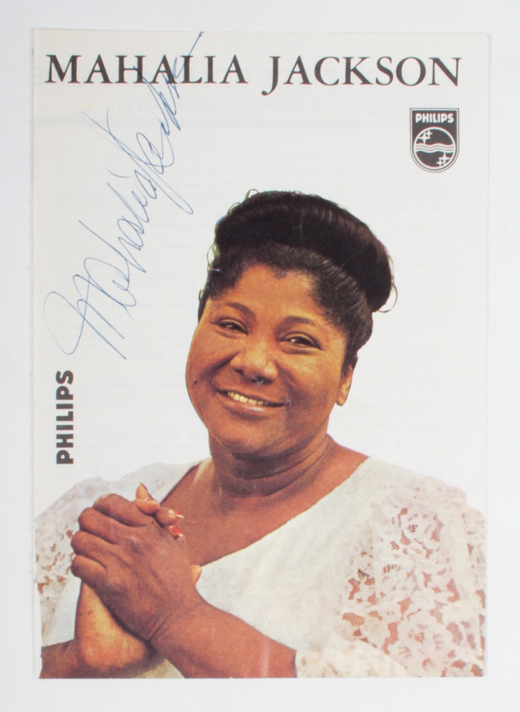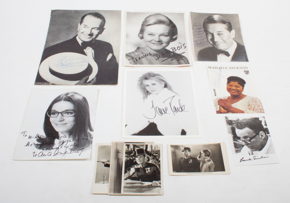 + Jeanne Darbois + Maurice Chevalier. All except Mahalia Jackson on photo/photocard. Jackson on Philips brochure. Nana Mouskouri with dedication, as is Maurice Chevalier. Second signature Chevalier on book Un Gala Maurice Chevalier, evolution 1957. 9 pp. Stapled. Added: 9 photo cards with image of Chevalier.