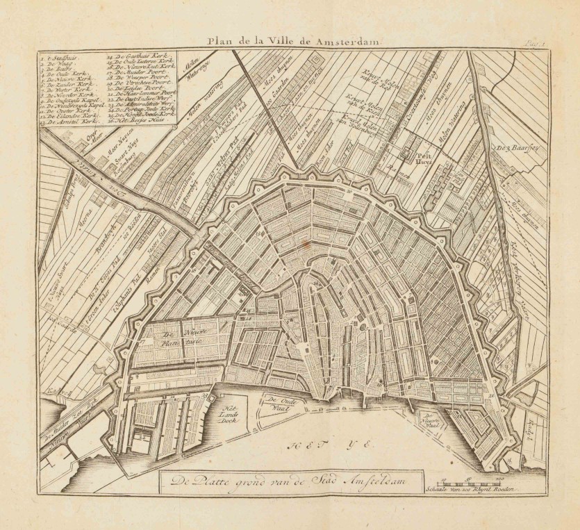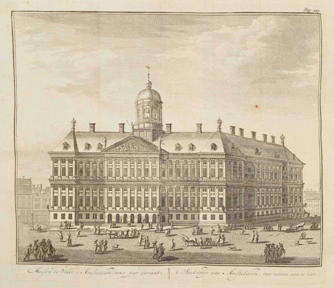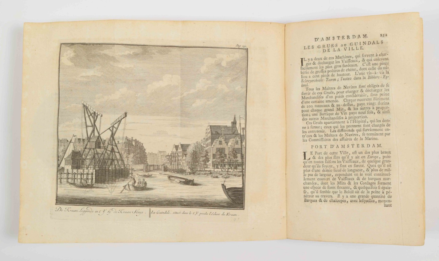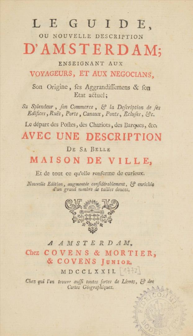 enseignant aux voyageurs, et aux negocians (...) avec une description de la belle Maison de Ville. Amsterdam, Covens & Mortier & Covens Jr., 1772. viii,332,(19) pp. 1 folding plan and 21 folding views. Contemp. boards. Stamp on title, boards worn and splitting on joints. Bookplate of Graf von Wintzingeroda to inside of front board. Good copy.