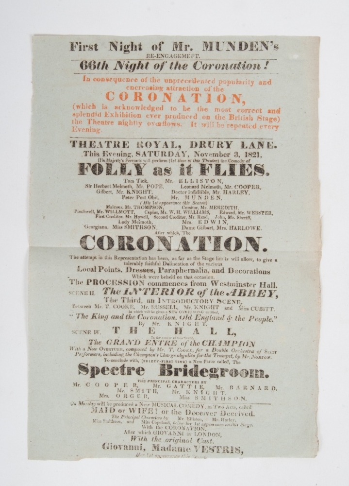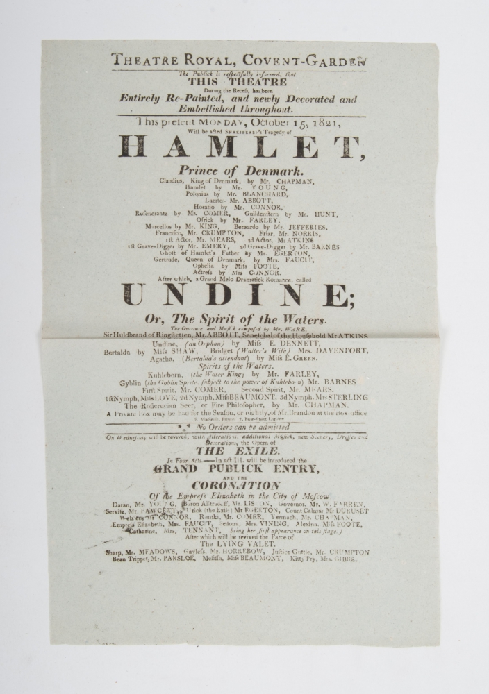 all on blue paper and ca. 33.5 x 21.5 cm., for performances on 15 October 1821 (Hamlet/ Undine), 18 October 1821 (The Exile/ Love Law & Physick) and 3 November 1821 (Folly as it Flies/ The Coronation/ Spectre Bridegroom, printed in red and black).