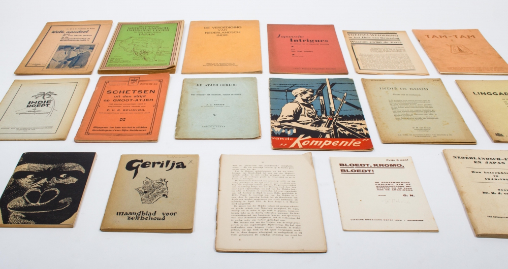 With: Linggadjati. De ontwerp-overeenkomst, de toelichting der commissie-generaal, de regeeringsverklaring. The Hague, Rijksuitgeverij, 1946, 40 p., original cover (staples removed, contents loose). And with another 14 works (all lacking staples in back), partly published shortly after WWII, incl. J.A. Kruijt. De Atjeh-oorlog. Kort overzicht van oorsprong, verloop en gevolg (1896); Gerilja. Maandblad voor zelfbehoud. 1st volume no. 1-2 [= all] (Amst., 1955); Tam-Tam. 7-R.S. Afscheids-nummer (Pelembang, 1948) (total 15).