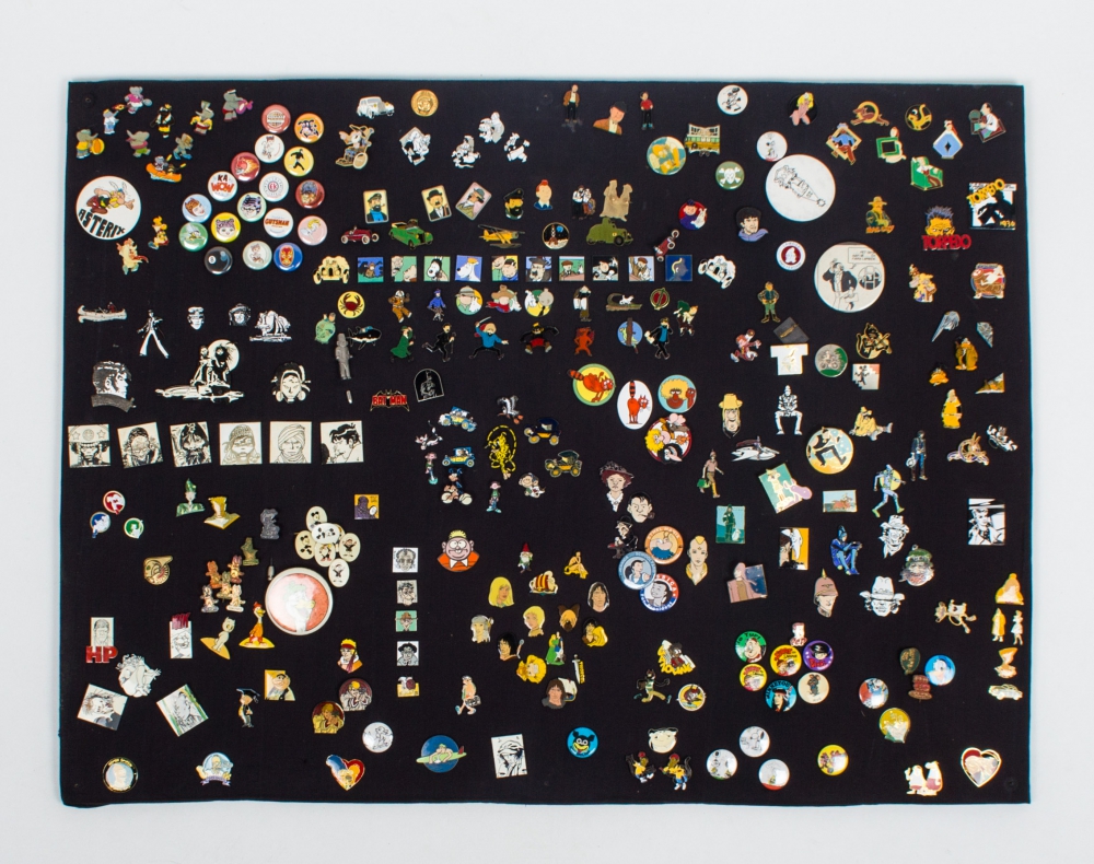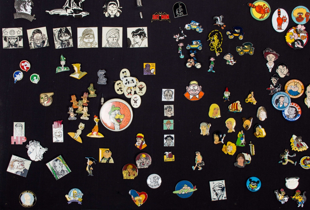 Ca. 230 comic pins and buttons, incl. Corto Maltese, Nero, Gaston, Tom Puss, Moebius, Freak Brothers, Tintin, Babar, Joost Swarte and others.