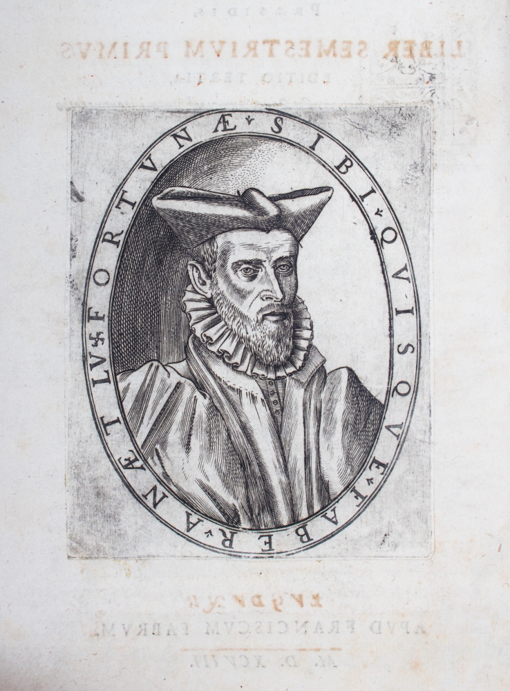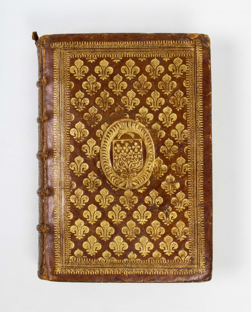Coloniae Allobrogum (Geneva), apud Franciscum Fabrum (volume 1-2)/ excudebat Stephanus Gamonetus, various editions, 1598-1611, 3 volumes in one binding, (28),174,(2 blank); (16),390,(9); (16),426,(22) p., titles printed in red and black and with woodcut printer's marks, title of volume 1 with engraved portrait of the author pasted on reverse, finely bound in slightly later rich gilt sheepskin, both boards with centered the coat of arms of Amiens and further fully covered in fleurs-de-lys (including the ribbed back), all edges gilt, 4to.