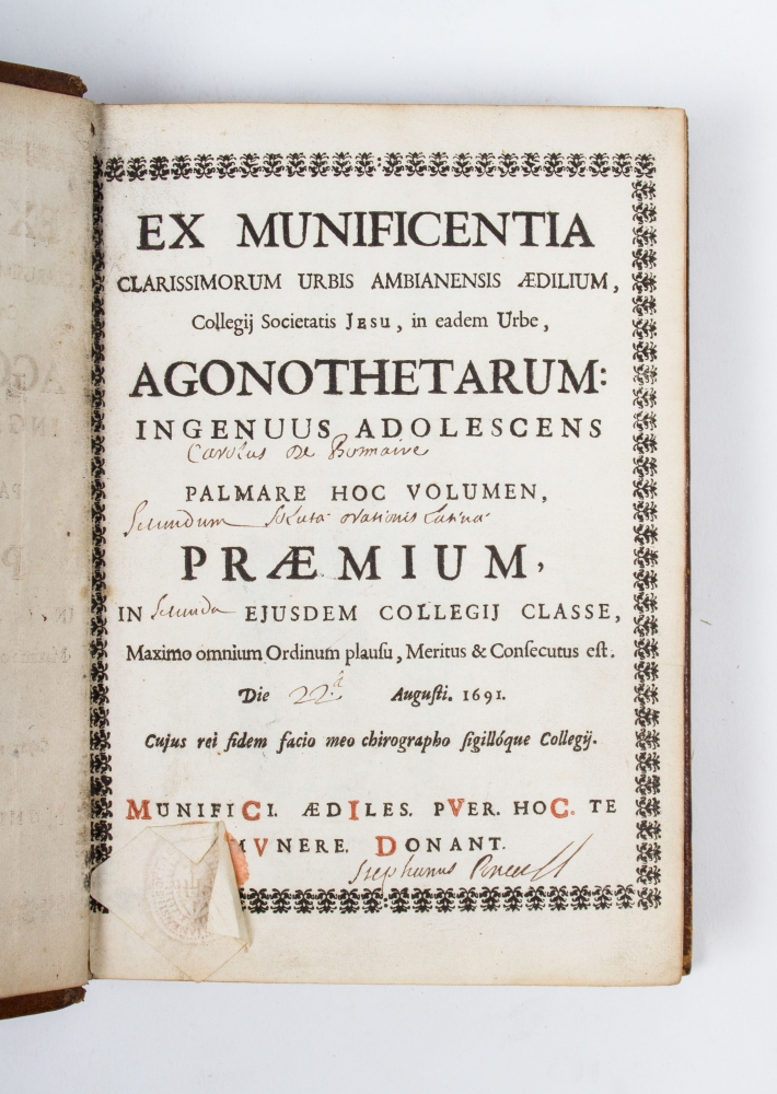 Pasted on the inner margin of the title page is the letterpress school prize of the Amiens Jesuit college, filled out in pen to Carolus de Bonnaire, dated 22 August 1691 and with the paper seal of the school. This school school prize also has a special "chronogramme double, libre et additionné", double due to date and fact, free because the sequence is mixed up, and added because this yields a year: "MunifiCi AedIles pVer. hoC. te mVnere Donant", with in red the combination of letters MCIVCVD. The calculation of the date is as follows: M = 1000, C = 100, IVC = 96, VD = 495, added together this makes 1691.