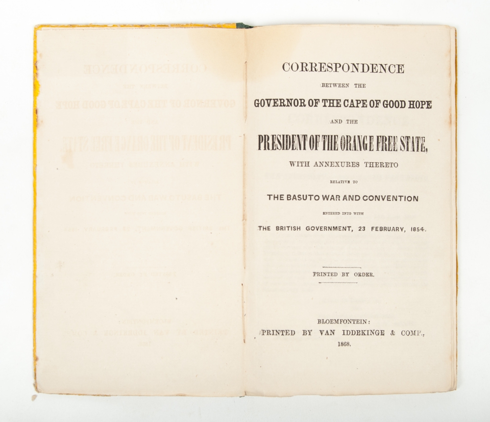 and the President of the Orange Free State, with annexes thereto relative to the Basuto war and convention entered into with the British government, 23 February, 1854. Printed by order. Bloemfontein, Van Iddekinge & Comp., 1868, (2),108 p., contemporary half cloth with manuscript paper spine shield, large 8vo.