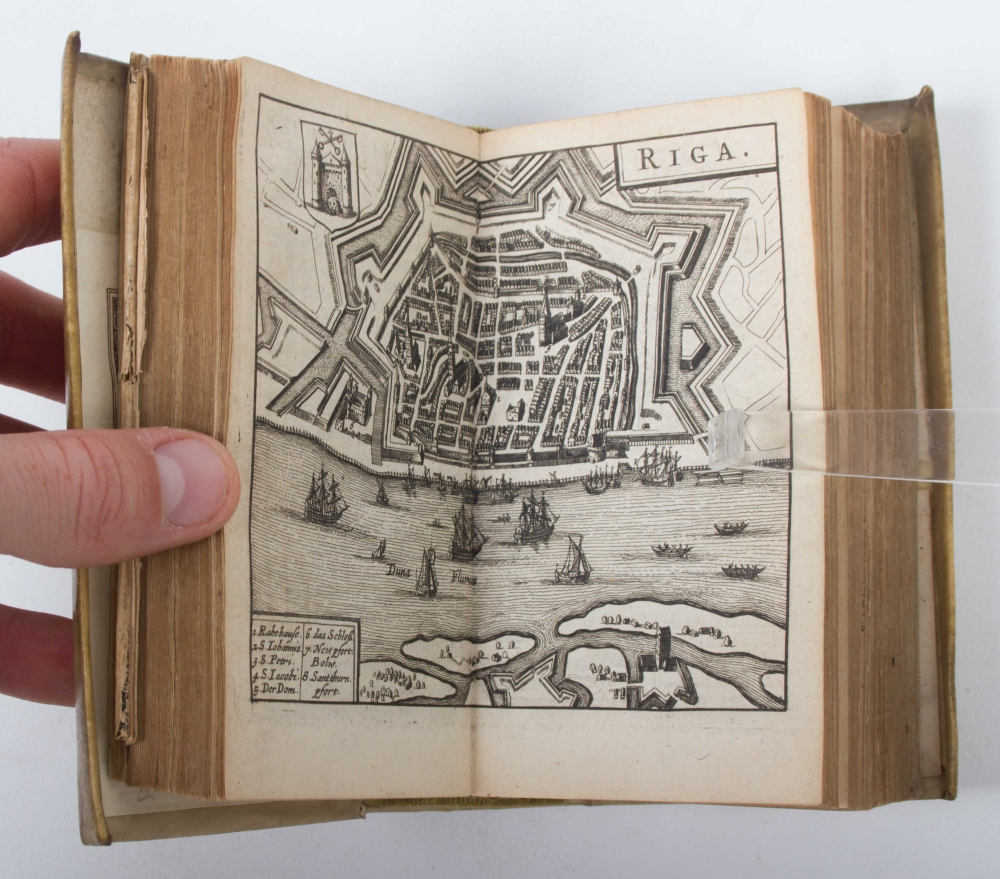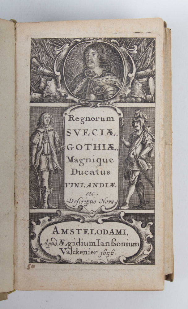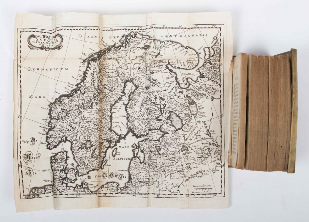 Gothiæ, magnique ducatus Finlandiæ, ut & Livoniæ, Bremensis ducatus, partis Pomeraniæ ad Suecos pertinentis, & urbis Wismariæ, descriptio nova [by Martin Zeiler]. Amsterdam, Aegidius Janssonius Valckenier, 1656, (33),(3 blank),783 [=777],32 p., with engraved title, large folding map, 2 folding profiles and 12 double-page city views/plans, contemporary overlapping vellum, 12mo.