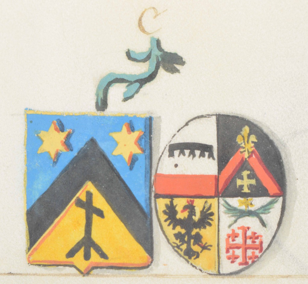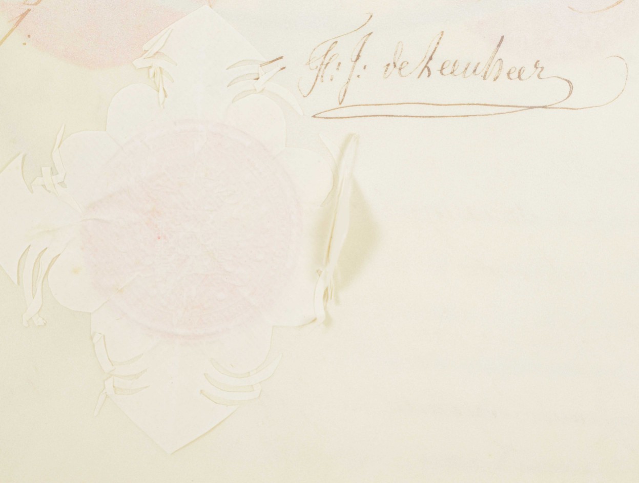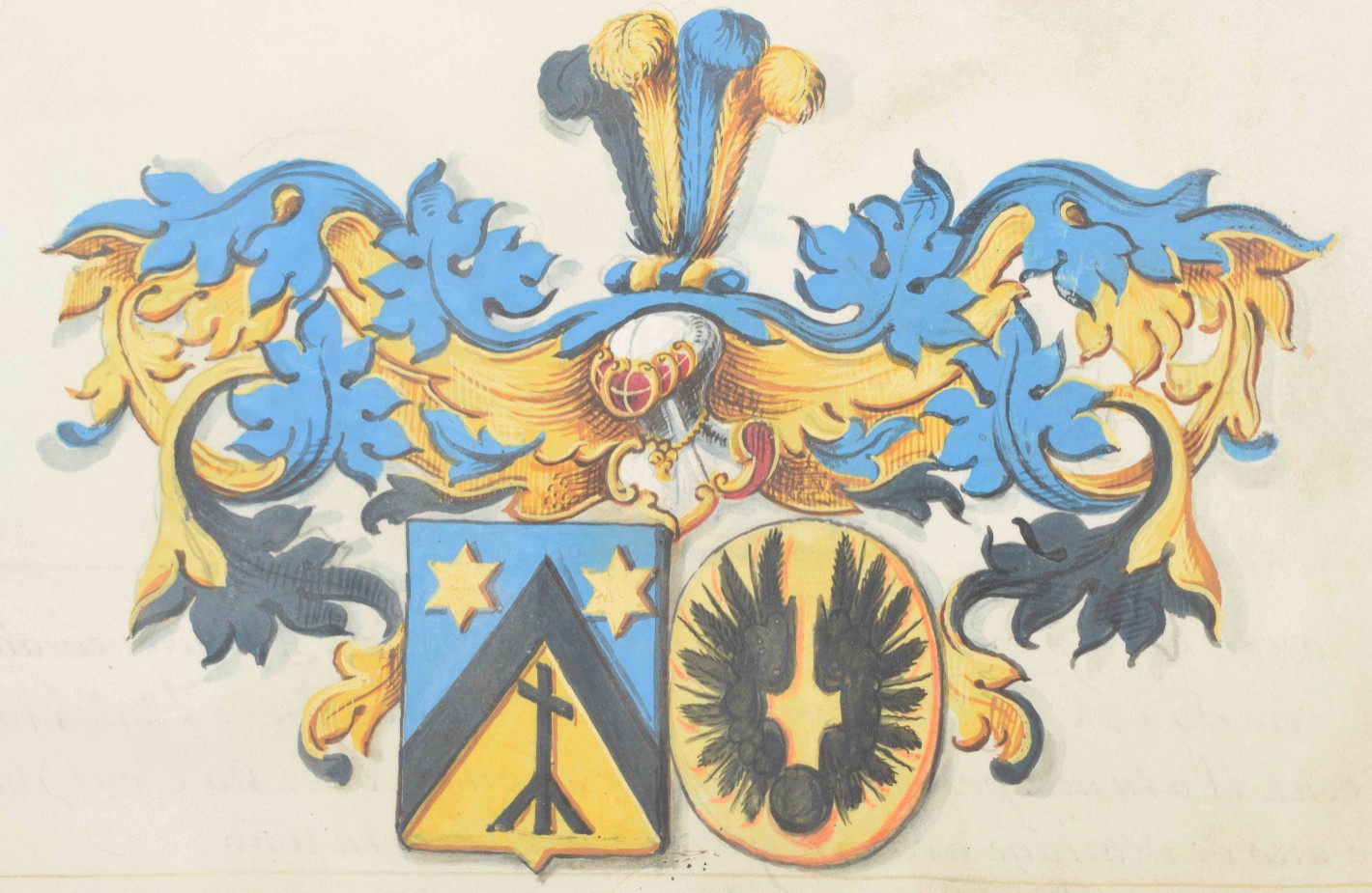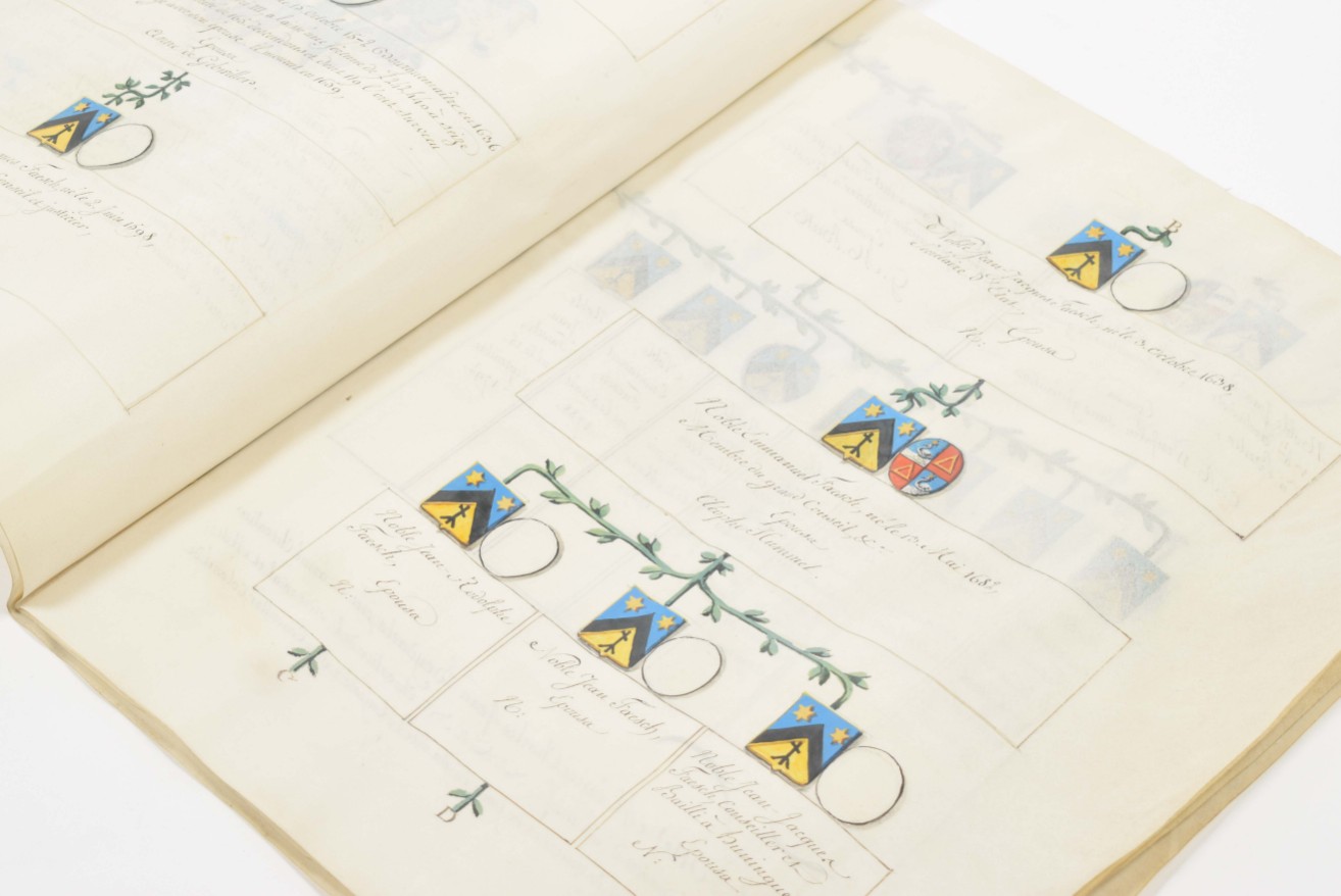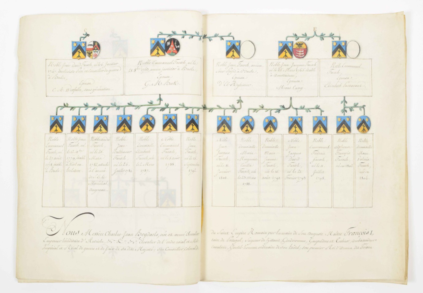 Vellum curled at outer edge, else very fine. Very attractive and colourful manuscript. The tree starts with Jean-Rodolphe Faesch and the date 1491 and ends with Marie Valerie Faisch, born in 1804. Charles-Jean Beydaels de Zittaert (1747-1811), was "eerste wapenkoning" of the Austrian Netherlands and the "Bourgondische Kreits" as well as head of the "Chambre Héraldique". We could not find information on Francois-Joseph de Leenheer. The text on the first page ends with the name "A. Glaser", perhaps the name of the calligrapher.