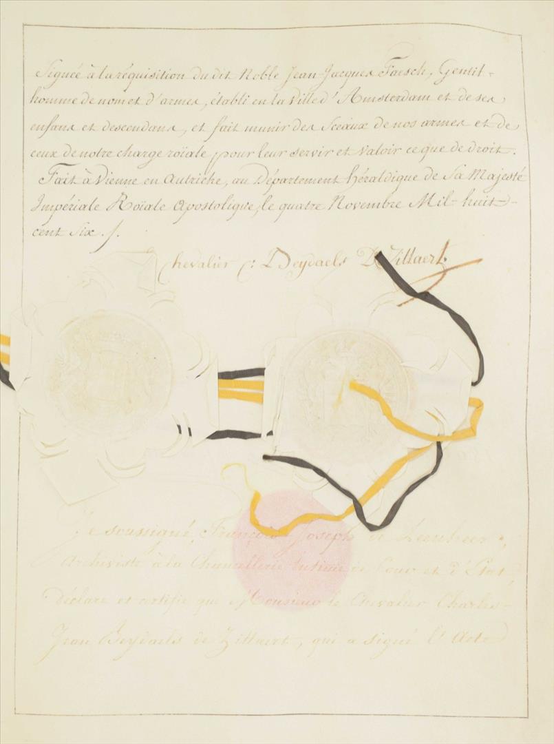 originaire de la Ville de Basle en Suisse." Calligraphed manuscript genealogical tree on vellum, (8) p., signed in pen by Charles-Jean Beydaels de Zittaert and François-Joseph de Leenheer, "Fait a Vienne, le 11 o.bre 1806", with large gouache coat of arms on the first page and 27 smaller coats of arms in the tree, with 3 wax and paper seals, threadbound velllum wrappers, 39.5 x 30.5 cm.