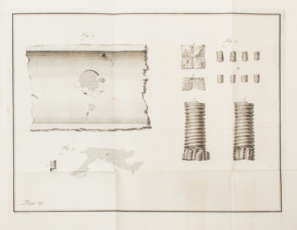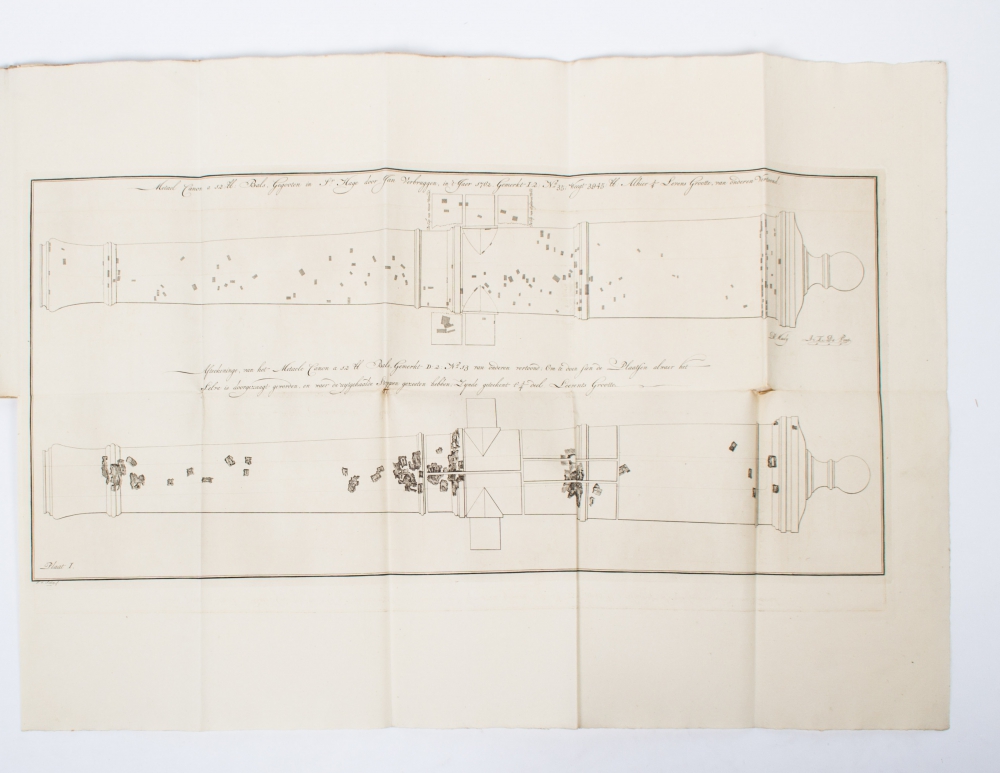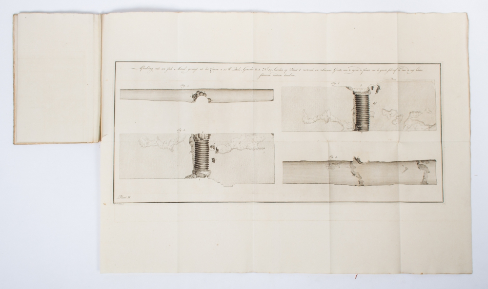 Interesting and rare report of a thorough investigation into 23 extremely unprofessionally cast cannon (in 1761 and 1762), illustrated with beautifully detailed, very large engravings. Artillery caster Jan Verbrugge from The Hague had attempted to cover up the defects to the cannon with plugs and tin cloths. From the very thoroughly executed investigation, however, more sloppy work emerges. The reports were signed by Captains of Artillery D.E. Musly and A.E. Du Pont and by "verbusser" W. van Dyck.