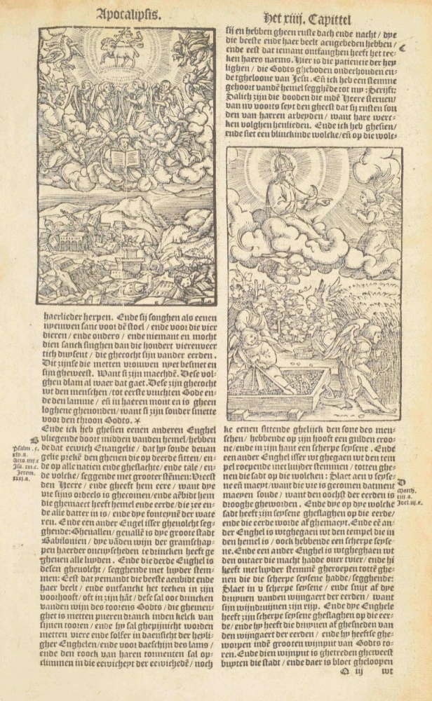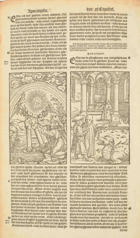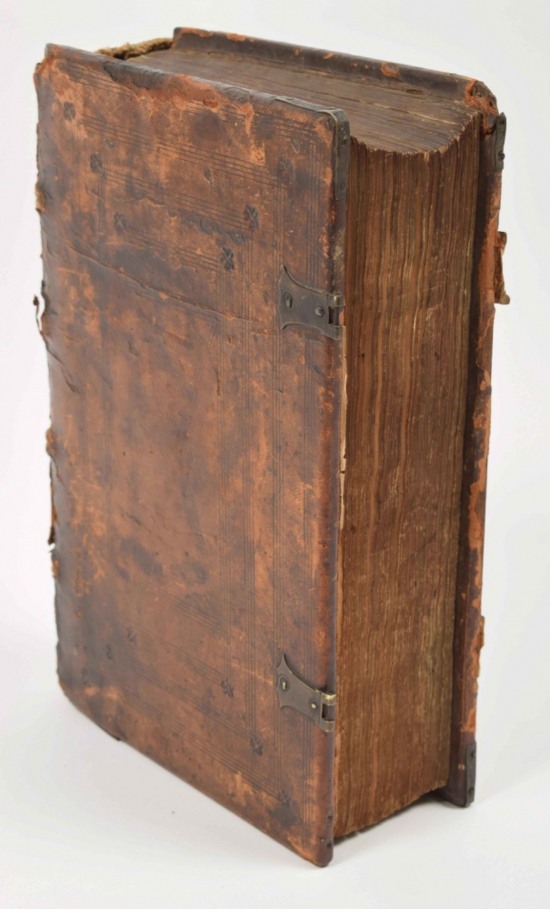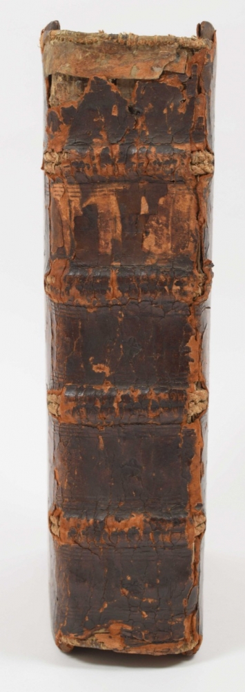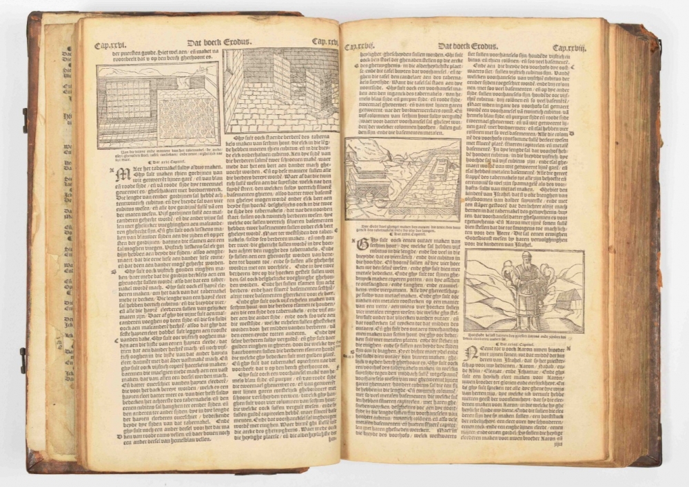 Title leaf damaged, else partly dam. in blank margins at the beginning and end, partly remargined or strengthened there (hardly any loss of text). Generally, the contents in between in good condition, occas. small defects and traces of age, a few misbound lvs. Binding dam./ worn at spine and along edges; leather at upper joint split, but good holding on thick double cords. In all, for this kind of book meant for daily use, an acceptable and complete copy in its original binding, with old owner's entries on (loose) upper free endpaper/ blanks: "Ad usum P.P. Capucinorum Hasselensium" and "Fratrum capucinorum Munsterclifiensium [?]". Rare Antwerp edition reprinted from the edition published at Leuven, 1553, as indicated on Bbb7v of the Old Testament. Translated and with introduction by the Leuven monk Nicolaus van Winghen, the first edition in this form appeared in 1548. The bible is illustrated with clearly different kinds of woodcuts, partly copies after Holbein and partly by various Antwerp artists such as Arnold Nicolai.