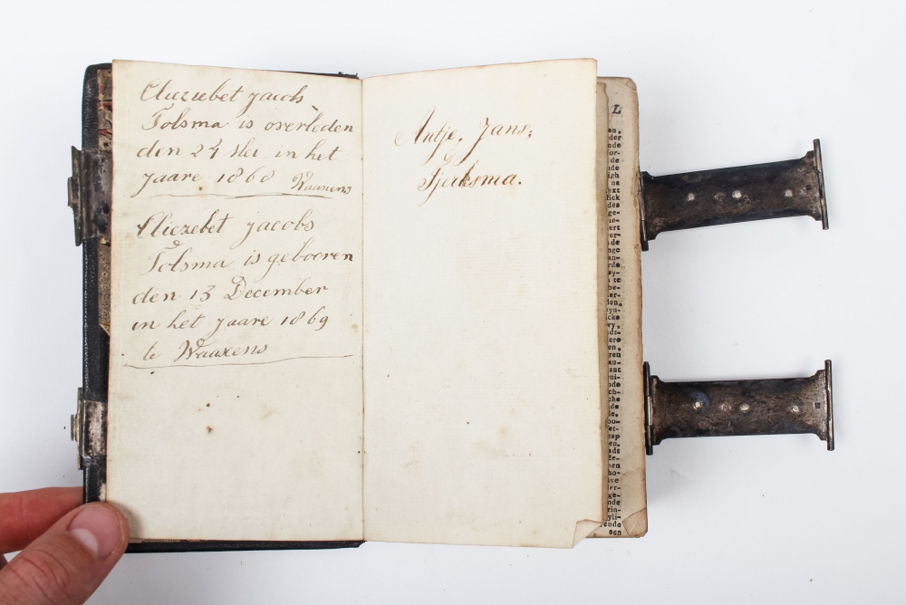 Back board virtually loose, spine damaged. Sold w.a.f. Contains: Biblia. Dat is de gantsche H. Schrifture (...), Dordrecht, 1794, with (partly loose) engravings, and Het boek der psalmen, Amsterdam, 1792.