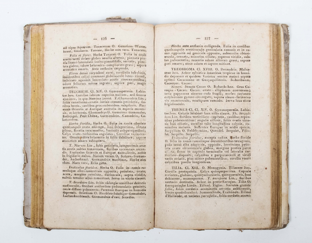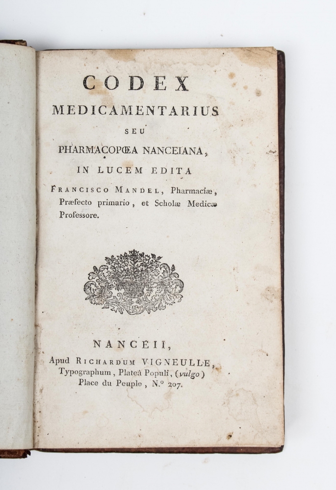 in lucem edita Francisco Mandel, Pharmaciae. Praefecto primario, et Schola Medicae Professore. Nancy, R. Vigneulle, n.d. (1795), LXXXVI [= LXXXIV],311,(1) p., with facing French and Latin text, finely bound in contemporary marbled calf ("treecalf"), gilt back with morocco title shield.