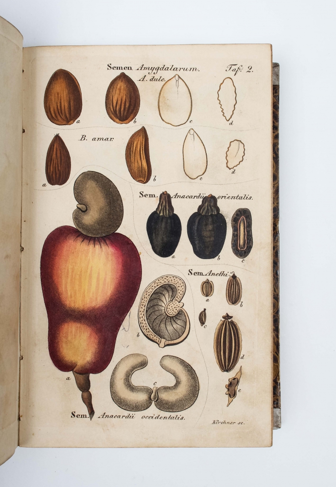 Here and there trifle foxed, spine ends with light wear, yet a very good copy. This very rare pharmacist's manual, published in installments, was originally planned in two volumes, with the first volume containing "Samen, Früchten, Blüthen und Kräuter", and the planned but not published second volume "Wurzeln, Hölzer und Rinden".