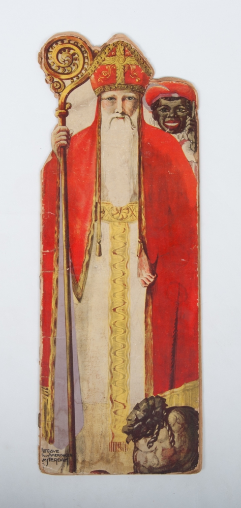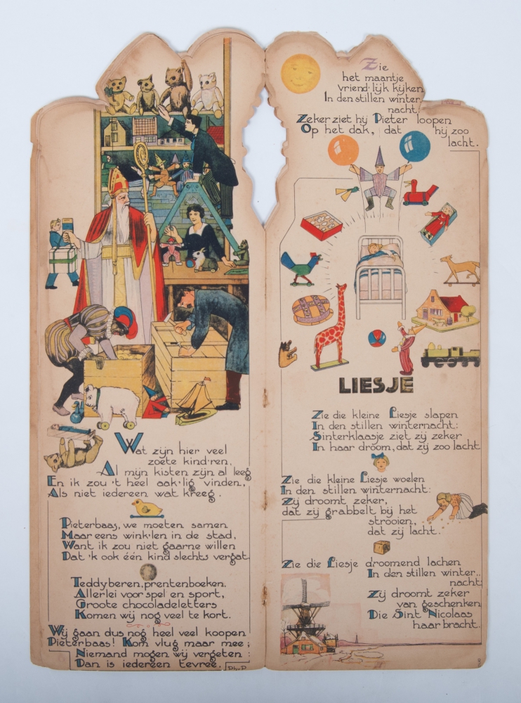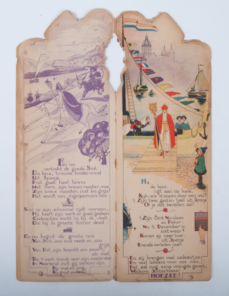 Prenten R. van Praag, versjes van Freddy Last, Ph. van Amerongen, Amsterdam, ca 1920. Folio oblong album in die-cut with illustration of Sint and Piet. Size 60 x 22 cm., with alternating purple/white and full-colour illustrations.