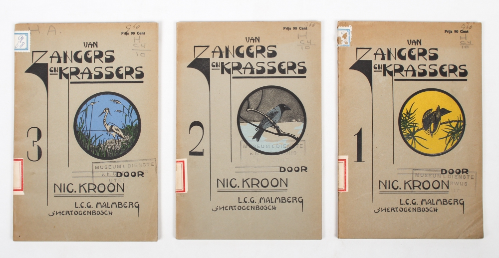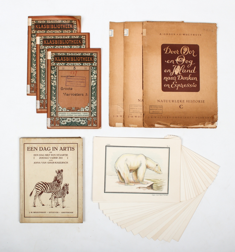 Incl.: (1) Kijkjes in de plantenwereld door Emilie C. Knappert. Met teekeningen van L.W.R. Wenckebach (Amsterdam, 1893, original printed cardboard with cloth back, 4to); (2) A. Groen E. Wolthuis. Door Oor en Oog en Hand naar Denken en Expressie. Natuurlijke historie A-C (Groningen/ Djakarta, ca. 1950, 3 envelopes with loose-leafed content, 4to size); (3) Door het rietland door E. Heimans en Jac. P. Thijsse. Tweede druk (Amsterdam, 1903); (4) Kijkjes in de plantenwereld voor de lagere school, (...) door K. de Vrieze (Groningen, 1891); (5) De grasparkiet. Zijne natuurlijke geschiedenis, leven in gevangenschap, verpleging en teelt door J. Aves (Zutphen, ca. 1900); (6) Van zangers en krassers. Vogels, die we moeten kennen door Nic. Kroon (Den Bosch, 1928, 3 volumes) (a total of 19 works in 25 volumes).
