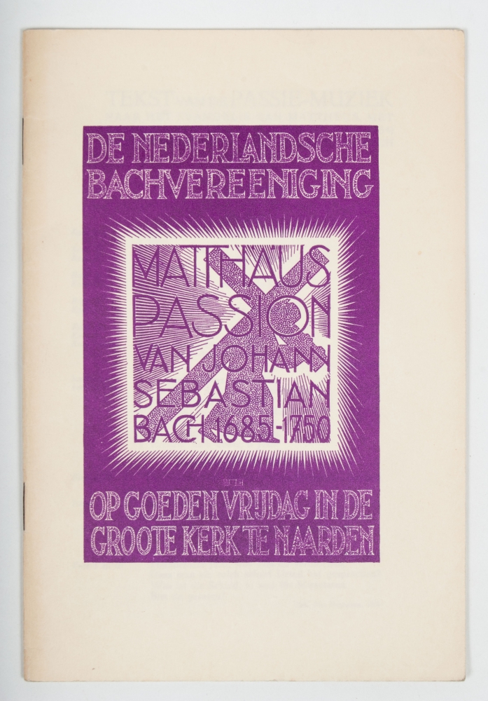 De Nederlandsche Bachvereeniging. Matthäuspassion van Johan Sebastian Bach 1685-1750. Op goeden vrijdag in de Groote Kerk te Naarden. Amsterdam, printed by M.J. Portielje for D.N.B., n.d. [1938], 23 p., original stapled wrapper printed in purple with woodcut monogrammed in block by Escher - and 2 similar (Locher/Bool 302, good copies).